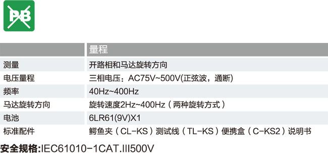 日本三和(sanwa)KS3相序表用于检测工业用电中出现的缺相、逆相、三相电压不平衡、过电压、欠电压五种故障现象,并及时将用电设备断开,起到保护作用。 产品特点 ■ 三相交流接触式安全相位检测■ 可检测三相电路的相序和开相 ■ 可测试马达旋转方向,通过手动旋转三相马达来检测旋转方向 ■ 相顺及活线状态可通过LED指示灯及蜂鸣来确认 ■ 高亮度发光开关按钮 ■ 利用指示灯对检相和欠相进行检查 ■ 采用易于夹持的大尺寸锷鱼夹,可以夹住电线 ■ 自动关机功能(5分钟)可取消,便于节约电池损耗 ■ 依据国际安全规格IEC61010-1CAT.III500V 技术参数 ![]() |