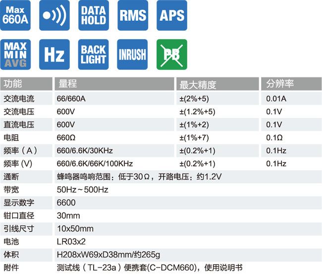 产品特点 ■ 大屏幕LCD显示带背光,6600数字显示,增强了可读性■ 真有效值交流钳表及万用表功能 ■ 可测试交直流电流、交直流电压、电阻、频率和通断 ■ 最大可测量交流电流660A , 最高分辨率0.01A ■ 可测突入电流,捕获启动浪涌电流(100ms内的最大值) ■ 峰值保持功能,可捕获涌流和脉冲信号(当按下峰值按钮,量程会固定在600A) ■ 相对值功能,保证测量数据的精度 ■ 最大/最小值,便于捕获信号变化 ■ 可使用测试线和钳头来测量频率 ■ 数据锁定用于观察和记录测量数据 ■ 通断检查蜂鸣音提示 ■ 自动省电关机功能(30分钟)延长了电池寿命 ■ 标配镀金表笔,防腐,防接触不良,提高测量的精度 ■ 钳口直径30mm ■ 抽样率:3次/秒 ■ 安全规格: IEC61010-1 CAT.III600V,IEC61010-2-032,IEC61010 031 技术参数 ![]() 选件 夹头适配器:CL-14,CL-13a,CL-15a,CL-DG3a,TL-9IC测试线:TL-21M,TLF-120 |