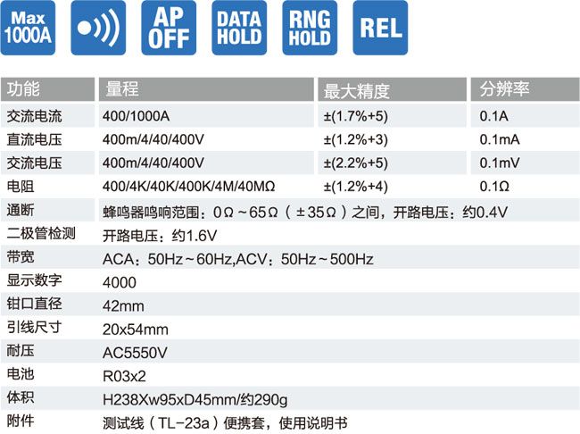 产品特点 ■ 大型液晶显示器,4000数字显示便于读数■ 交流钳表及万用表功能 ■ 可测试交流电流、交直流电压、电阻、通断和二极管 ■ 最大可测量交流电流1000A , 最小分辨率0.1A ■ 带有蜂鸣器的通断测试 ■ 相对值功能,保证测量数据的精度 ■ 量程锁定可以准确读取数据 ■ 数据锁定用于观察和记录测量数据 ■ 自动省电关机功能,延长了电池寿命 ■ 标配镀金表笔,防腐,防接触不良,提高测量的精度 ■ 钳口直径42mm ■ 抽样率:3次/秒 ■ 频带宽度:50〜500Hz ■ 安全规格:IEC61010-2-032 (2002), CAT.Ⅲ600V 技术参数 ![]() 选件 夹头适配器:CL-14,CL-13a,CL-DG3a,CL-15a,TL-9IC测试线:TL-21M,TLF-120 |