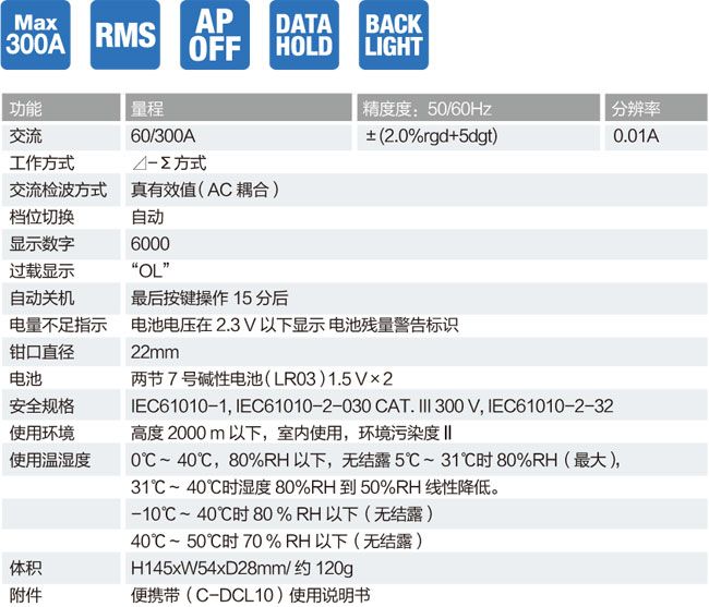 产品特点 ■ 细小的钳头适用于狭窄空间, 性能先进,方便实用,可单手操作,使用安全■ 大屏幕数码显示和背光,即使在光线较弱的位置也能有效读数,增强了可读性 ■ 交流真有效值,自动切换档位 ■ 最大可测量交流电流300A , 最高分辨率0.01A ■ 数据锁定用于观察和记录测量数据 ■ 自动省电关机模式(15分钟)可解除,延长了电池寿命 ■ 钳口最大开口直径22mm ■ 抽样率:2次/秒 技术参数 ![]() |
