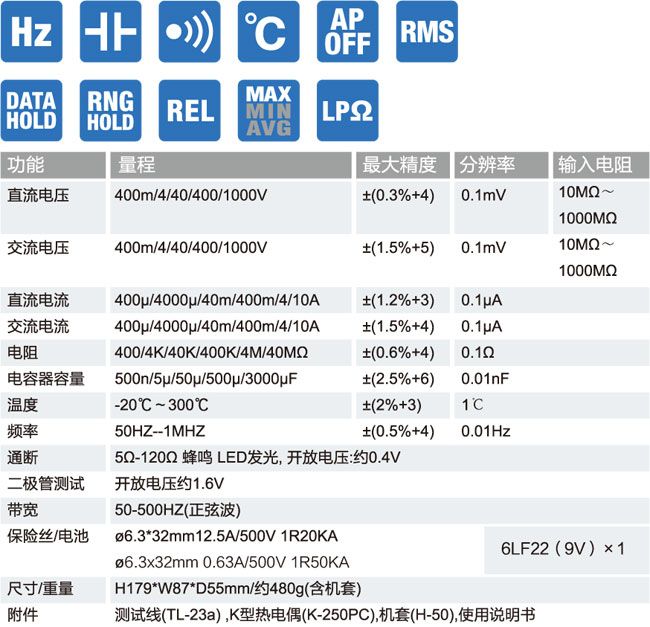 日本三和(sanwa)RD701紧凑型真有效值数字万用表,可单手操作,使用方便,完全适应工业电气现场工作人员使用。设计坚固,外壳保护套使用抗撞击的合成橡胶,即使跌落,也能有效的保护仪表。大型液晶显示器,大数码显示。 产品特点 ■ 3-3/4位4000数据显示,0.3%的最高精确度■ 交流真有效值,可精确的进行各种交流信号负载的测量 ■ 具有交直流电压、交直流电流、电阻、电容、频率、二极管和温度测量功能 ■ 通断蜂鸣音提示 ■ 高输入阻抗1000MΩ ■ 最大可测到3000µF的大电容器容量检测功能 ■ 高频率检测,最大可测1MHz ■ 数据锁定用于观察和记录测量数据 ■ 量程锁定可以准确读取数据 ■ 保证测量数据精度的相对模式,排除电阻测量时测试导线对测量数据的干扰 ■ 最大值锁定可捕获输入的最大值 ■ 电流测试端子的防误插报警功能,当测试线错误的插入电流端子时蜂鸣报警,提高了安全性 ■ 内置温度计,无需携带更多工具选配K型热电偶温度传感器可测温度:-50℃〜800℃ ■ ADP功能,通过柔性电流钳头与数字表相结合,可测量高达3000A交流电流 ■ 可选配多种钳形探头用于测量交直流电流和微电流(选件) ■ 选配的HV探头可以测量30KV直流高压 ■ 标配镀金表笔,防腐、防接触不良,提高测量的精度 ■ 自动省电模式(30分钟)可取消,延长了电池寿命 ■ 仪表外壳和电路板使用不易燃材料 ■ 使用保险丝对电流功能进行保护 ■ 带保护套(可悬挂/测试线可固定)倾斜座 ■ 频带宽度:50-500Hz ■ 抽样率:3次/秒(Hz除外)、2次/秒(频率)RMS ■ 输入电压:20VACrrms以下 ■ 输入信号:正弦波或是40%--70%占空比的方形波 ■ 输入灵敏:10Hz—20KHz/0.9Vrms以上:20KHz—500KHz/2.6Vp或1.9Vrms以上 500KHz—1MHz/4.2Vp或3Vrms以上 ■ 安全规格:IEC1010 CAT.III600V Max/CAT.II 1000V Max 技术参数 ![]() 选件 钳形探头:CL3000 HV探头:HV-60 温度探头:K-8-800,K-8-650,K-8-500,K-8-300,K-8-250 K型适配器:K-AD 便携套:C-CD 夹头适配器:CL-14,CL-13a,CL-15a,CL-DG3a,TL-8IC 测试线:TL-21M,TLF-120 |