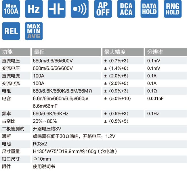 日本三和(sanwa)PM33a便携复合型万用表和钳形表,二合一功能。外形独特,尺寸小巧,易于操作,可随身携带并装入口袋的一款复合型万用表。具有在狭窄的环境中解决电气问题的能力,更加便捷,更好的安全保护措施。 产品特点 ■ 3-5/6位6600数据点,大屏幕液晶显示屏,增强了可读性■ 具有交直流电流、交直流电压、电阻、电容、频率、占空比和二极管测试功能 ■ 交/直流电流可测量至100A ■ U形开放式电流钳头(7mm) 可以在0度角到180度角测量 ■ 最大/最小值,用于记录信号波动情况 ■ 数据锁定用于观察和记录测量数据 ■ 量程锁定可以准确读取数据 ■ 相对值功能,保证测量数据的精度 ■ 电池低电量警告表示 ■ 自动省电模式(30分钟)可取消,延长了电池寿命 ■ 抽样率: 3次/秒 ■ 安全规格:IEC61010-1 CAT.II 600V, CAT.III 300V 技术参数 ![]() 选件 选件便携盒:C-DG3a 夹头适配器:CL-14, CL-15a, CL-DG3a,TL-9IC, TL-A7M2 |