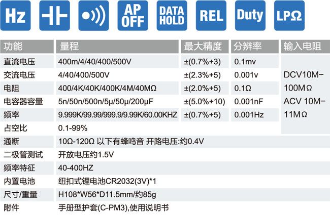 日本三和(sanwa)PM3小型超薄便携式多功能数字万用表,外观独特,厚度8 5mm,可随身携带并装入口袋。大数码的大屏幕液晶显示屏,增强了可读性。 产品特点 ■ 3-3/4位4000数据点■ 0.7%最大精度 ■ 自动和手动量程 ■ 量程锁定可以准确读取数据 ■ 过载显示功能 ■ 具有电压、电阻和二极管检测功能 ■ 蜂鸣器鸣响的通断检测 ■ 测试正负极颠倒时符号—显示 ■ 自动关机功能(无任何操作15分钟后) ■ 电池低电量提示 ■ 标配镀金表笔,防腐、防接触不良,提高测量的精度 ■ 使用保险丝对电流功能进行保护 ■ 使用保护套保护仪表 技术参数 ![]() 选件 选件夹头适配器:CL-13a、CL-15a |