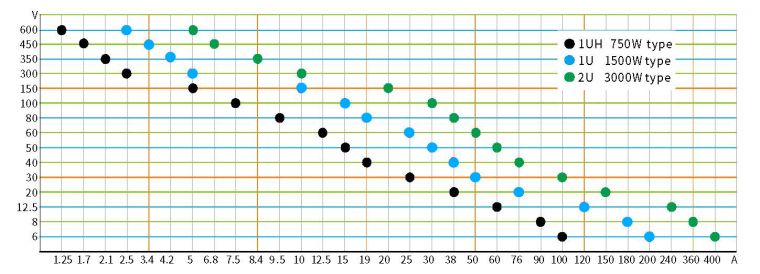 - 输出电压范围从6V-600V,输出电流从1A-400A。