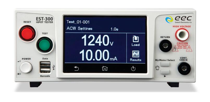 A4面积的尺寸设计,便于任何空间摆设配置,搭配重量仅5.5公斤可堪称市场上轻巧的耐压测试仪,不但让用户携带方便更增加器材的使用弹性。 |  |  | 三合一耐压测试仪 单机拥有完整功能:交流耐压(ACW)、直流耐压(DCW)、及绝缘阻抗(IR)。可随意组成多种不同测试程序,满足各种测试需求。 | | 高度测试效率 此产品搭配EEC**之缓升上限功能(Ramp-High)与充电下限功能(Charge-Low)技术,可设定电流判断的上下限值,过滤人为因素造成的回路断线,以及电器特性的脉冲电流所造成的测试误判,提升整体测试效率。 |  |  | 快速放电、安全关键 EEC**之快速放电装置,能使被测物在测试后50ms的短时间内放电,避免残余电压造成人员触电风险,增强测试环境安全度。 | | 提高制造生产质量 EST-300具有业界指标性的ARC电弧侦测功能,许多知名大厂指定专用的测试标准,可透过侦测被测物异常电流回路,筛选出线路短路不良品,避免微小锡渣及绝缘空间不足等因素造成产品日后绝缘崩溃,提高制造生产质量。 |  |  | TüV安全认证 TüV认证(EN 61326-1),质量安全可靠且值得信赖。 |