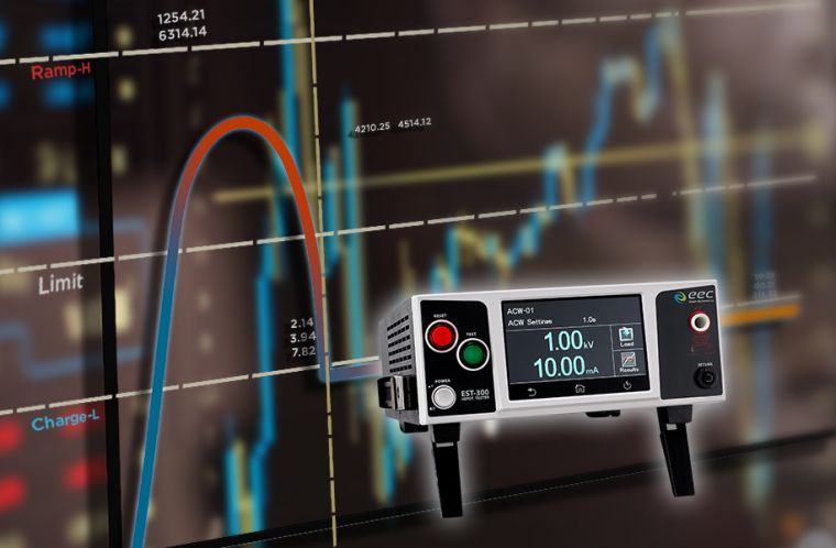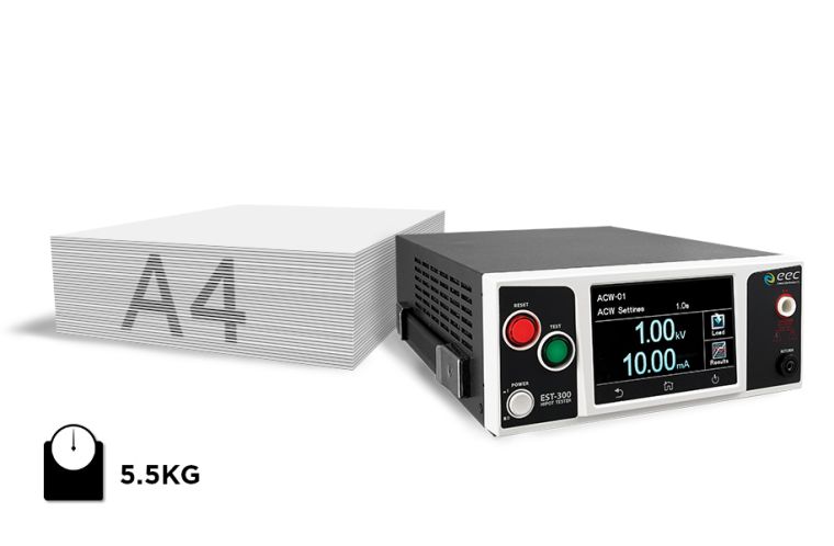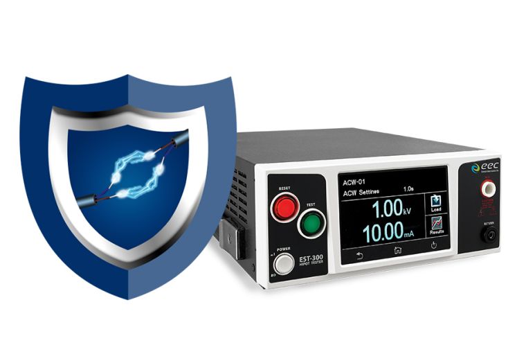 A4面积的尺寸设计,便于任何空间摆设配置,搭配重量仅5.5公斤可堪称市场上轻巧的耐压测试仪,不但让用户携带方便更增加器材的使用弹性。 |  |  | 三合一耐压测试仪 单机拥有完整功能:交流耐压(ACW)、直流耐压(DCW)、及绝缘阻抗(IR)。可随意组成多种不同测试程序,满足各种测试需求。 | | 高度测试效率 此产品搭配EEC**之缓升上限功能(Ramp-High)与充电下限功能(Charge-Low)技术,可设定电流判断的上下限值,过滤人为因素造成的回路断线,以及电器特性的脉冲电流所造成的测试误判,提升整体测试效率。 |  |  | 快速放电、安全关键 EEC**之快速放电装置,能使被测物在测试后50ms的短时间内放电,避免残余电压造成人员触电风险,增强测试环境安全度。 | | 提高制造生产质量 EST-300具有业界指标性的ARC电弧侦测功能,许多知名大厂指定专用的测试标准,可透过侦测被测物异常电流回路,筛选出线路短路不良品,避免微小锡渣及绝缘空间不足等因素造成产品日后绝缘崩溃,提高制造生产质量。 |  |  | TüV安全认证 TüV认证(EN 61326-1),质量安全可靠且值得信赖。 |