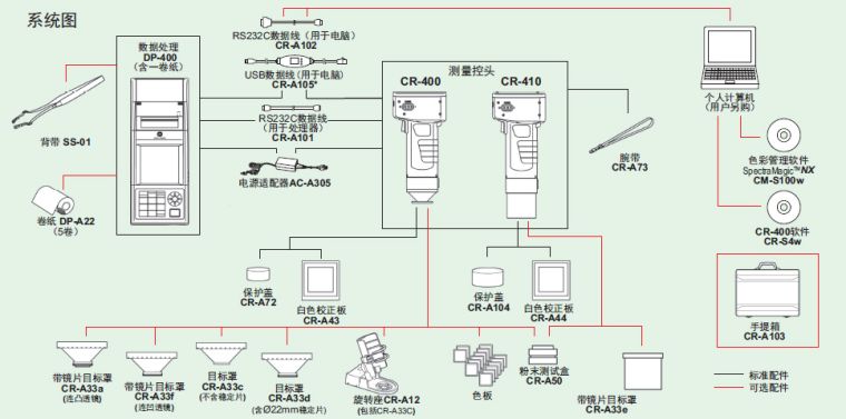 新推出的柯尼卡美能达“CR-400”、“CR-410”色彩色差计可通过测量头单体进行测量,它具有高精度、多功能的优点并且操作简便。 **的色彩色差计系列—功能更加强大和多样 源自**的色彩色差计系列,功能更加强大和多样。新型色彩色差计CR-400是广受认可和备受赞誉的CR-100、CR-200、CR-300系列的继任者。它具备大量附加功能,用途更加广泛,但却完全保留了全光学特性,因此确保可以与之前型号交换数据。CR-400的测量区域为8mm,适于测量各行业领域的反射色和色差。它能够满足配料、食品、原材料、成品、药物及皮肤病学等多方面的应用。如果待测物具有特定构造或表面不均匀,如粒状物、织物、木材、石头、砖块等,那么CR-410是您的明智选择。其独特的50mm特大孔径非常适合测量此类样本,不需要再进行多次测量然后取平均值。 新型号的主要改进在于增加了易用性和功能性,如重新设计数据处理机、配备大屏幕背光显示屏(可以数字或图形方式显示测量数据)及内置高速热敏打印机。数据内存可存储多达100种目标色及1000条测量结果。多种新色空间、合格/不合格公式及白/黄度指标增强了仪器在多方面的应用。新“自定指标”功能允许最多6名不同用户输入,或使用XYZ、Yxy或CIELAB值输入6组针对特定应用的公式。另外,显示语言可设为英语、德语、法语、意大利语、西班牙语或日语。为进一步增强使用灵活度,测量头装备了显示屏、功能键及电源,可不依赖数据处理机独立使用,或直接作为附加另售件连接计算机,通过另售的Windows®QC软件SpectraMagic NX运行。第四代色彩色差计具备多种新增功能,拥有良好的易用性,且经久耐用,必定会在现代色彩控制领域再创辉煌!