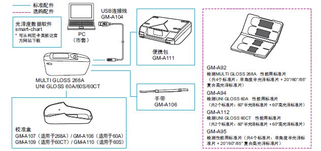测定物体表面的光泽程度 Multi Gloss 268A的测量角度为20°、60°、85°,Uni Gloss 60A/Uni Gloss 60S/Uni Gloss 60CT只能进行60°角测量。 采用彩色液晶显示屏,大幅提升了使用体验,查看测量结果更轻松。 小巧轻便,便于携带,操作简单。 本设备标配了全新软件“smart-lab Gloss”,可用于将数据从设备传输到计算机,或进行在线测量。 使用一块AA碱性电池供电,可进行约4,000次测量。 符合 ISO、ASTM、DIN、JIS(GM-60S除外)的国际规格,10种显示语言可选。 采用彩色液晶显示屏 与旧机型比较更亮、更易于阅读的显示屏