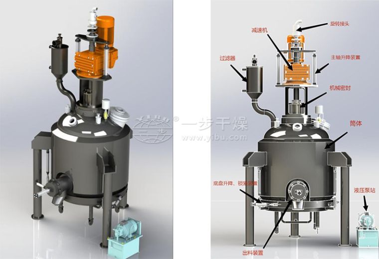 ●过滤 将上游反应釜或结晶设备产生的固液混合物晶浆放料到三合一设备罐体内,以压力差为推动力实现固液混合物的过滤分离。实际应用中有加压压滤、真空抽滤以及加压抽真空组合形式过滤等。加压压滤采用洁净的压缩空气、氮气或其他惰性气体。根据实际经验,制药行业一般产品压滤压力0.2~0.3MPa即可实现过滤,化工或食品行业一些产品需要较高的过滤压力,有的压力达到1.0MPa。 ●洗涤 过滤工艺完成后,需要进行下一步工艺操作,即洗涤。三合一设备罐内装有特制的喷淋装置,可使清洗(洗涤)液均匀分布于罐内,通过开启搅拌系统、搅拌升降机构、传动机构,可使桨叶进行旋转运动和上下轴向运动,使物料得到充分的洗涤,将晶粒表面粘附的杂质洗涤干净。洗涤所用的洗涤液和洗涤次数需按物料、生产工艺特点而确定。 ●干燥 三合一设备的干燥工艺可以采用真空干燥。影响真空干燥工艺的因素主要是真空度、干燥时间、搅拌桨特性等。真空干燥过程是采用真空系统将罐内的惰性气体抽走,使气体分子数减少,隔绝空气,主要适合于易氧化变质的物料,也适合于蒸发需要回收溶剂的物料、热敏性物料。真空状态下,可以减少物料染菌的机会,或者抑制某些细菌的生长,因此特别适合于无菌物料的干燥。 ●出料 干燥物料通过S型搅拌浆的反转推动物料从侧出斜口自动卸出