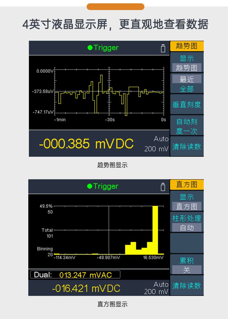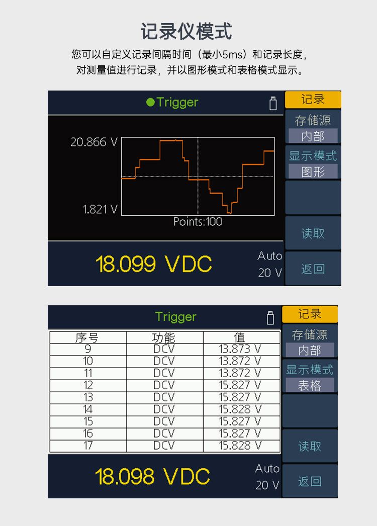 + 4英寸高分辨率 TFT 液晶显示; + 真正的5 1/2 位分辨率 + 最快高达150rdgs/S 测量速度 + 真有效值交流电压电流测量 + 支持2 线和 4 线电阻、频率、导通、二极管测试等 + 支持双显示 + 记录仪图表功能,可分析变化趋势 + 支持标准的SCPI控制命令,可通过网口,USB,RS+232,WIFI(选配)对万用表进行远程控制及数据的上传 + 多种接口:USB Device,USB Host,RS+232,网口,方波输出,外部触发输入等