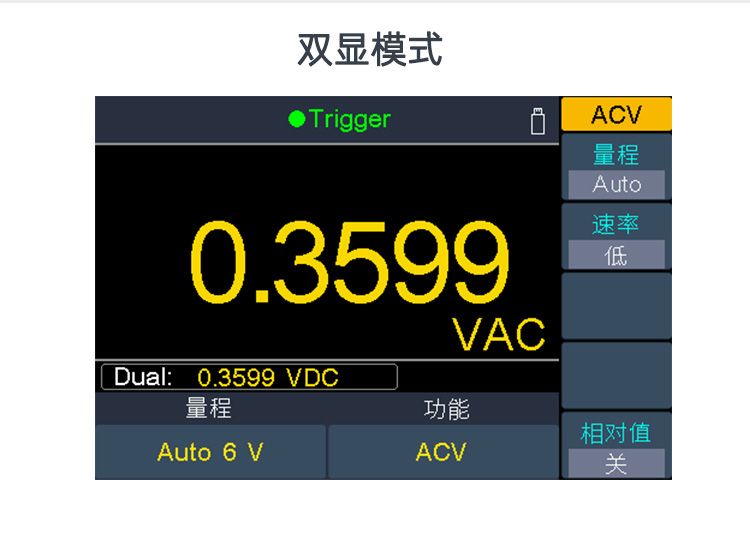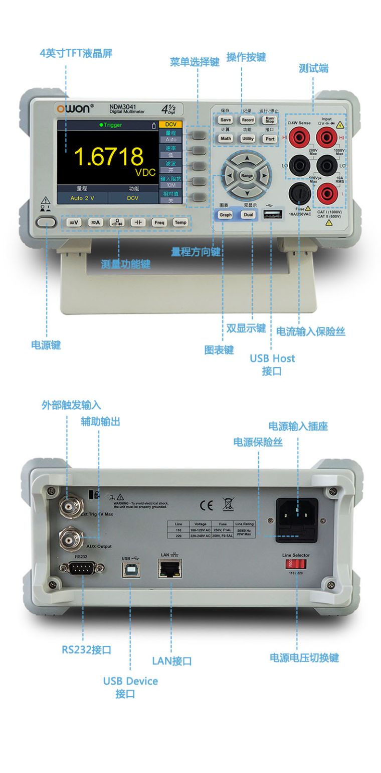 + 4寸(480x320) 高分辨率TFT 液晶 + 真正的4 1/2 位分辨率 + 最快高达150rdgs/S测量速度 + 真有效值交流电压电流测量 + 支持双显示 + 记录仪图表功能,可分析变化趋势 + 支持标准的SCPI控制命令,可通过网口,USB,RS+232,WIFI(选配)对万用表进行远程控制及数据的上传 + 多种接口:USB Device,USB Host,RS+232,网口,方波输出,外部触发输入等