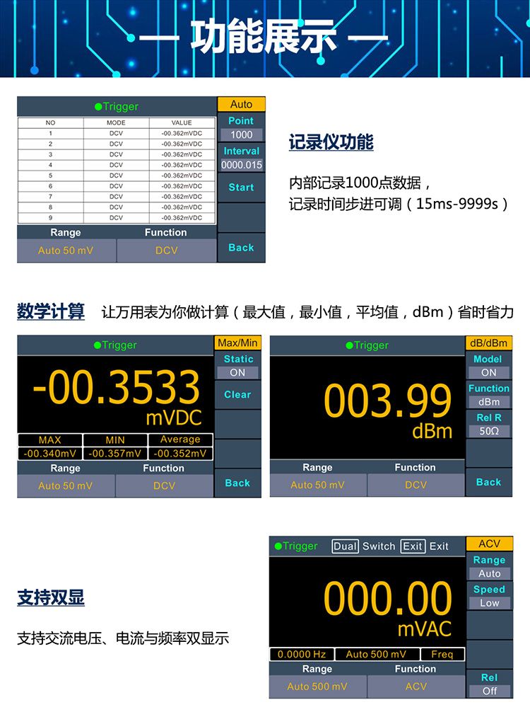 + 3.7英寸高分辨率TFT 液晶显示; + 最大显示55000 + 最快高达65rdgs/s测量速度 + 真有效值交流电压电流测量 + 支持双显示 + 内置记录仪功能,可分析变化趋势 + 支持标准的SCPI 控制命令