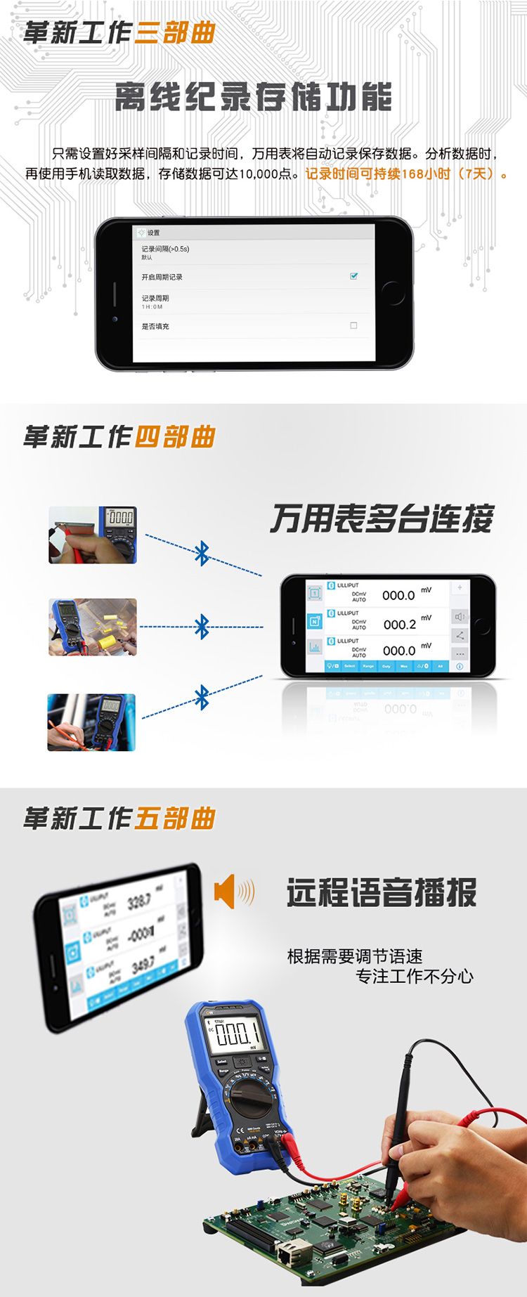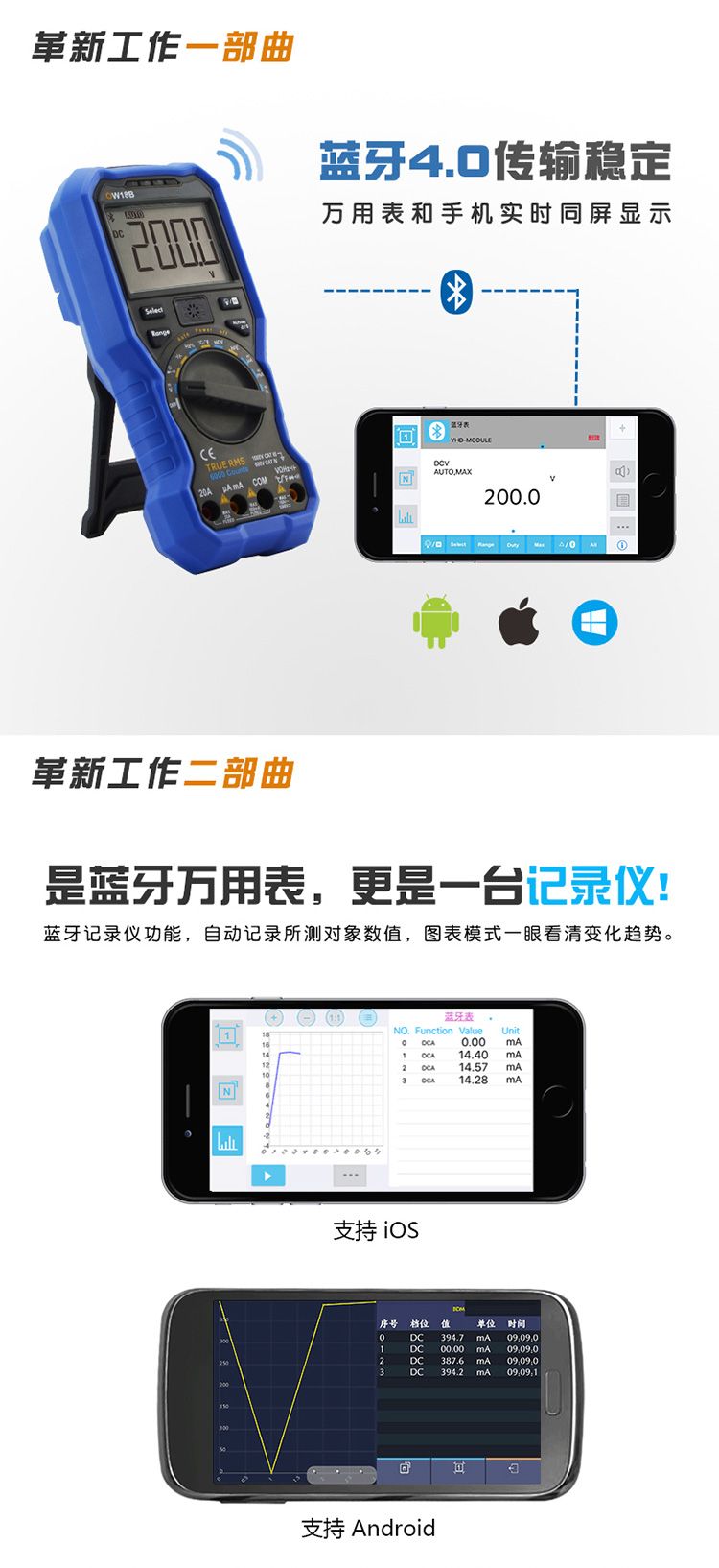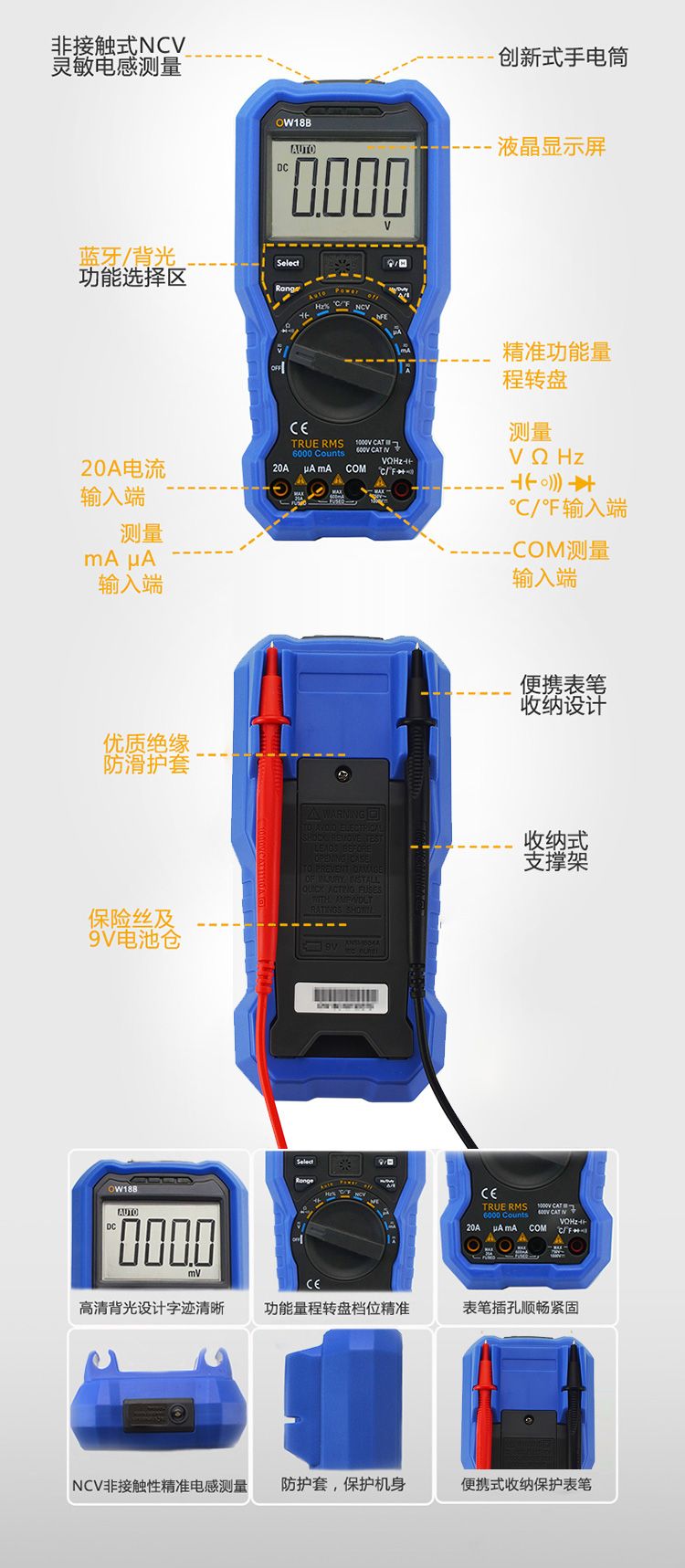 + 3 5/6位测量精度 + 蓝牙4.0无线传输,传输稳定,功耗低(OW18B) + 记录仪+多用表+测温仪(OW18B) + 记录图表模式,分析变化趋势(OW18B) + 手电筒功能,轻松应对黑暗环境(OW18B) + 支持NCV非接触电压感应 + 标配真有效值、自动量程功能 + 标配离线记录功能(OW18B) + 支持安卓、苹果、Windows系统(OW18B)