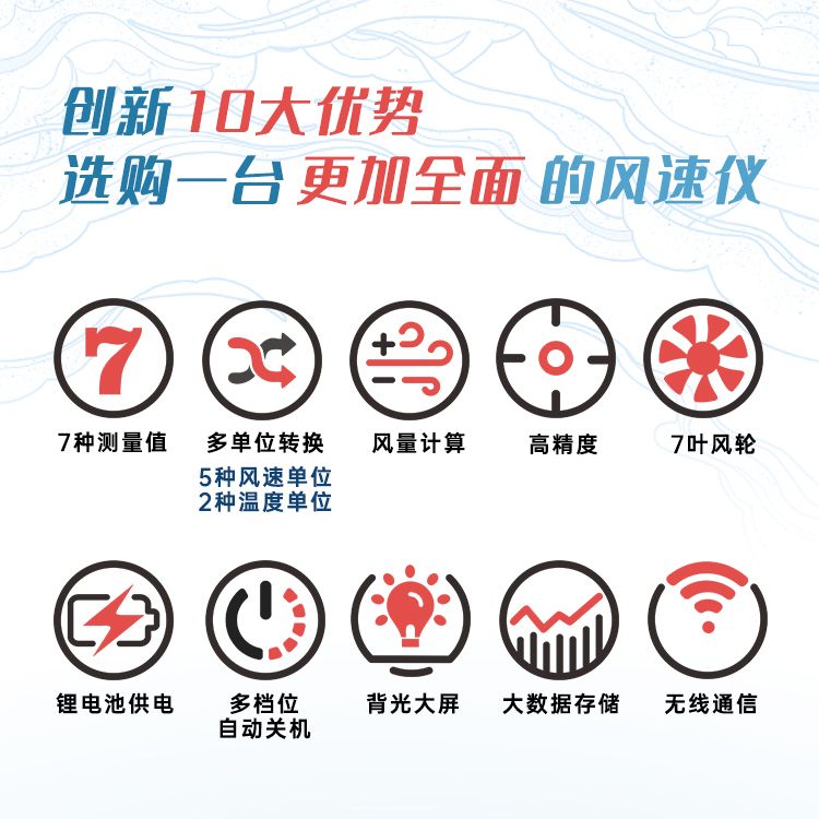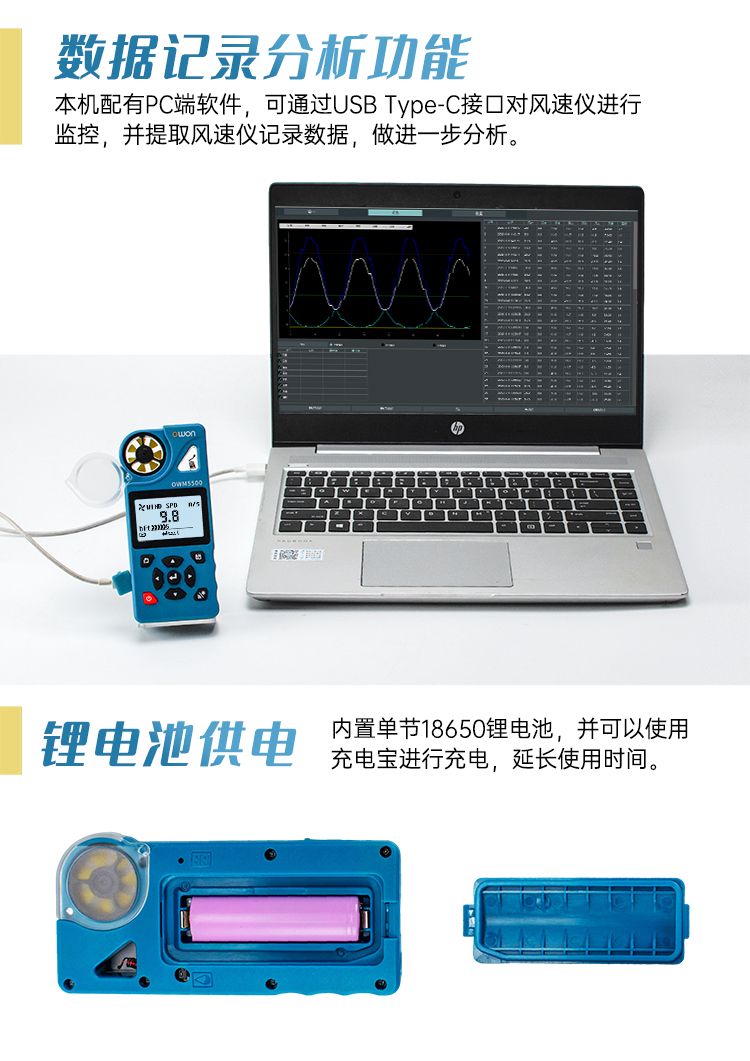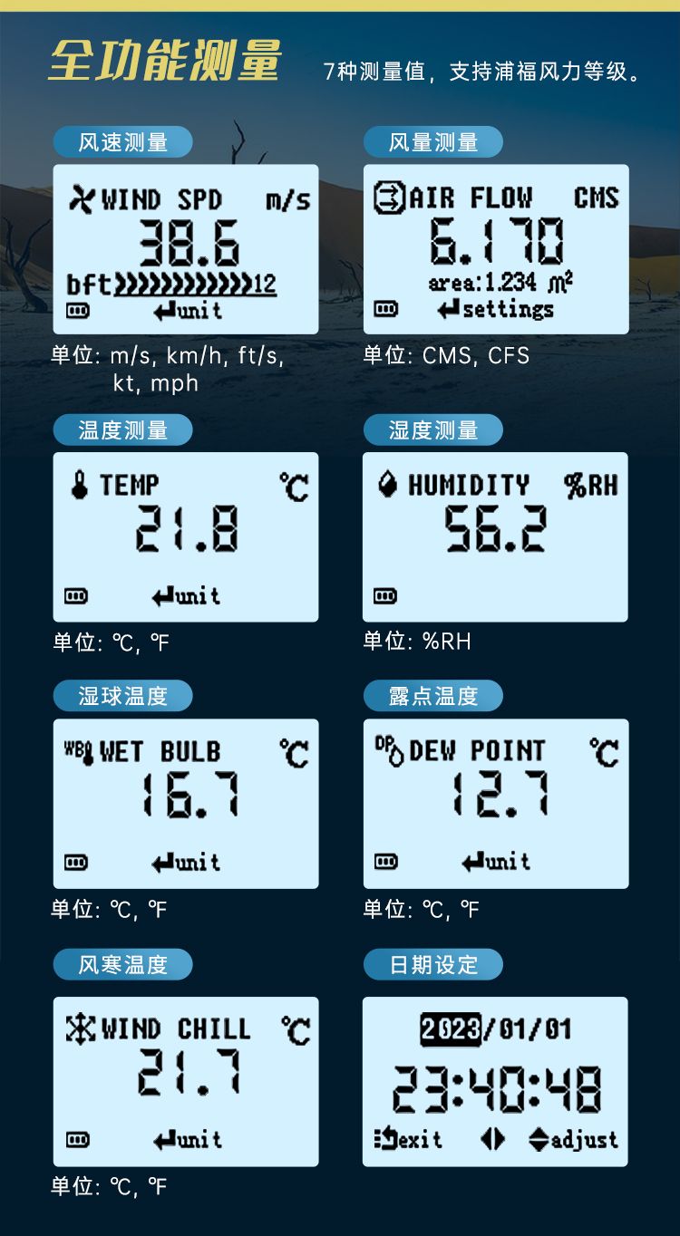 +可测量包括风速、风量、温度、湿度、露点温度、湿球温度、风寒温度等7种测量值,支持浦福风力等级。 +图表显示模式,可分析趋势,对数据进行统计。 +内置8000组数据存储,可自动或手动存储,支持数据一键清零。+多档设定自动关机,节能省电。 +内置锂电池,通过USB TYPE-C接口可连接充电宝,提供更长使用时间。 +支持智慧生活APP远程查看与控制。 +支持数据曲线图模式,并可将数据导出,通过PC软件进一步分析。