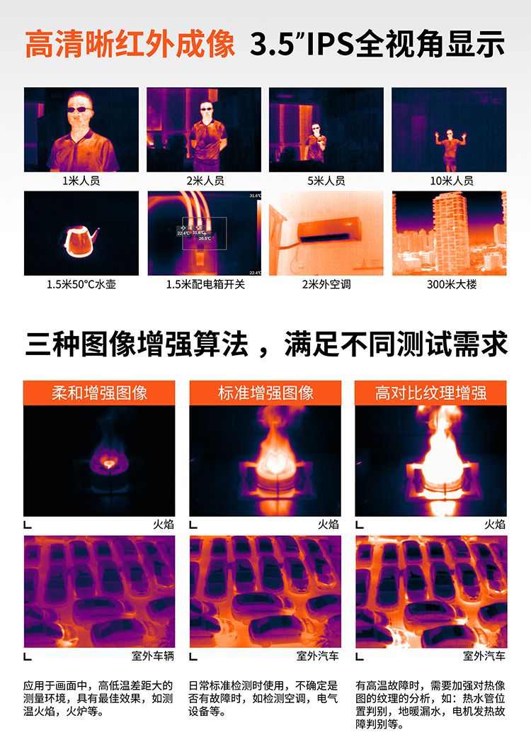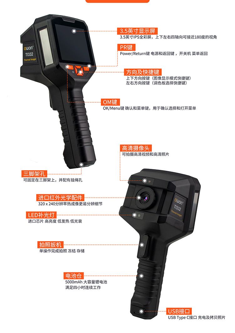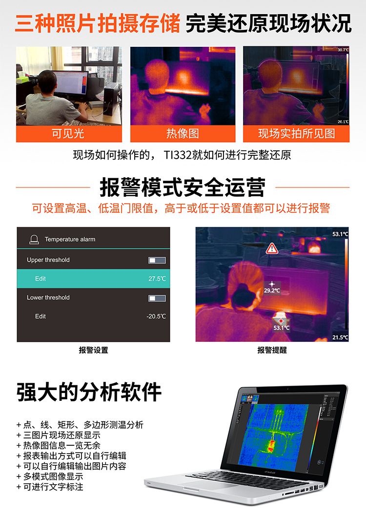+ 红外热成像320*240分辨率 + 可见光和红外三种融合模式 + 三种图像增强模式适合不同应用 + 自定义高低温限值报警 + 电脑分析软件满足更专业的行业应用 + 多种测温方式让温度无所遁形 + 5种色板可选(黑热、白热、彩虹、铁红、增强铁红) + 大容量内部存储器最高可存储2万张照片 + 测温范围-20℃~350℃ + 发射率可调(0.01-0.99)默认0.95 + 拍照采用三照片存储,多视角分析 + 3.5英寸TFT LCD