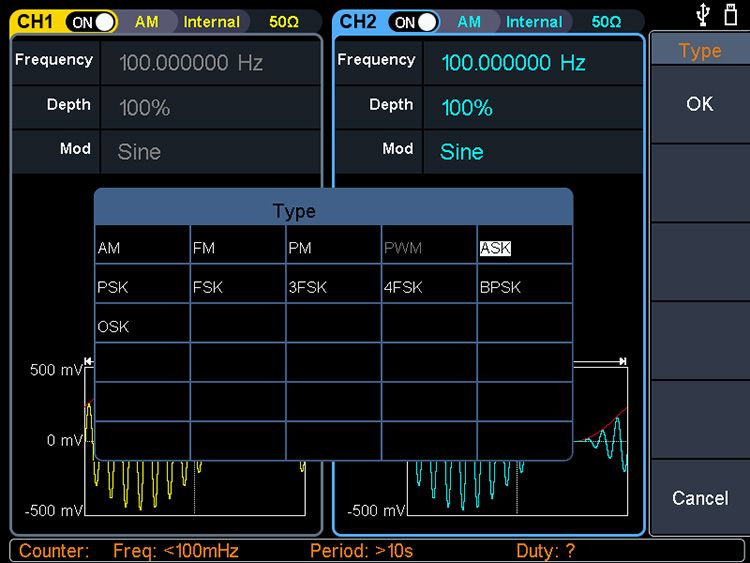 + 丰富的调制功能:AM、FM、PM、PWM、FSK、3FSK、4FSK、PSK、OSK、ASK、BPSK、Sweep、Burst