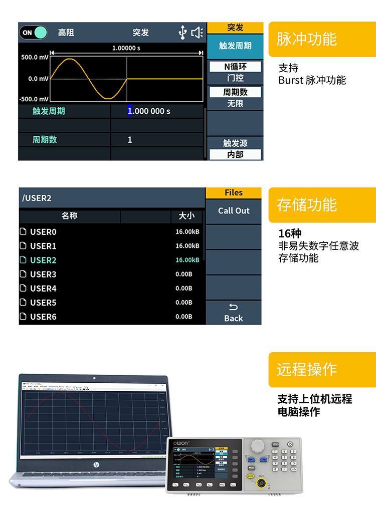 + 丰富的波形输出:5种基本波形,内置sinc、指数上升、指数下降、心电图、高斯、半正矢、DC电压等共计150余种