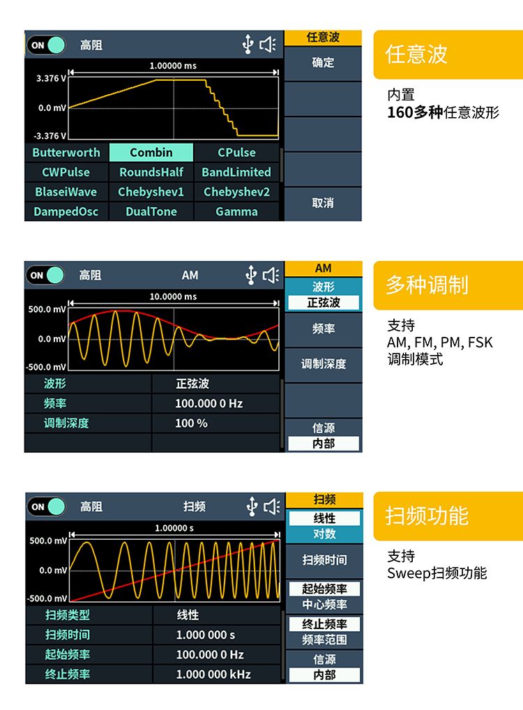 + 丰富的调制功能:AM、FM、PM、FSK、sweep、Burst
