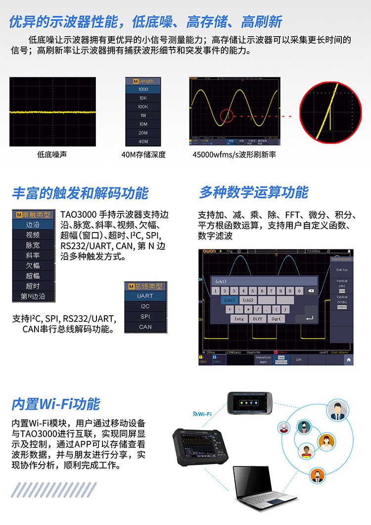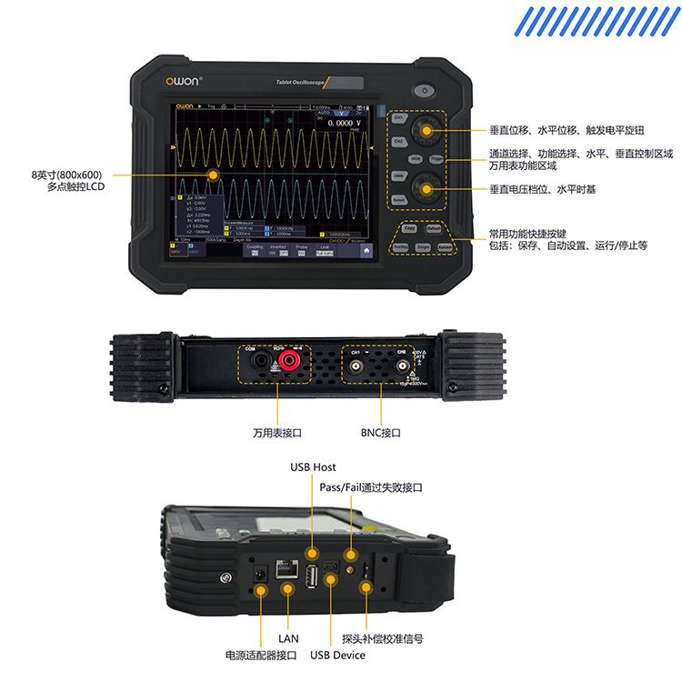 + 示波器+万用表双功能合一(2通道机型) + 带宽最高120MHz,v实时采样率1GS/s + 最高可选14位高精度垂直分辨率 + 最高 40M 存储深度,45,000 wfms/s 波形刷新率 + 低本地噪声,小信号测试更准确 + 8 英寸(800 x 600)多点触控液晶屏 + 支持SCPI、 LabVIEW + 多种高级触发和解码功能 + USB host, USB device,LAN,WIFI(选配)通信接口