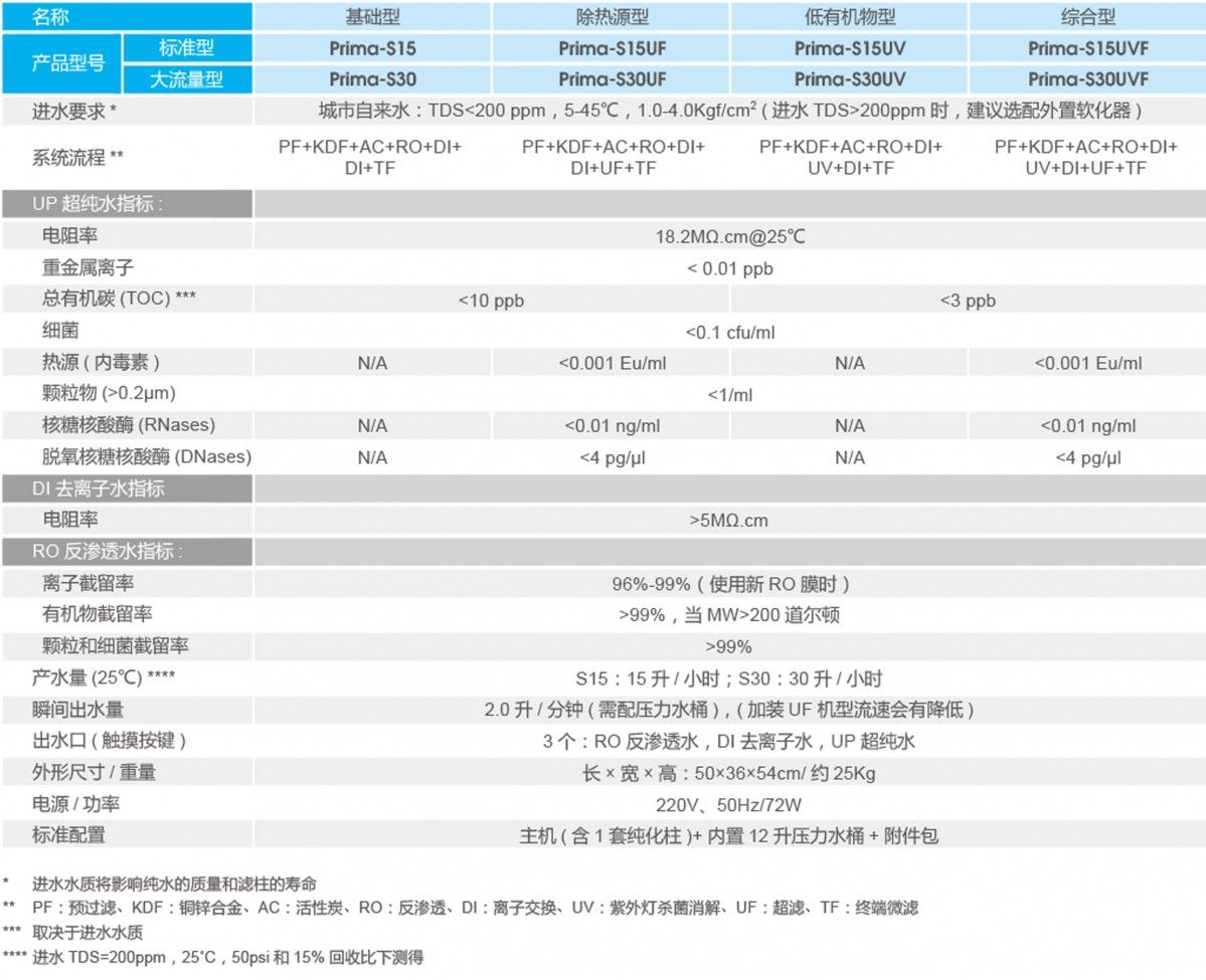 Prima 系列采用业内最大尺寸的亚克力水晶全触摸屏面板,3 路水质监测、流量统计、5 级滤芯报警、漏水报警、女声语音报读信息、万年历时钟等功能,系统内置 12 升压力水桶、一体式滤芯,是 卓越的性价比之选! 现有 Prima-Q/S 2 个子产品系列,可产出RO 反渗透水、DI 去离子水 / 高纯水、UP超纯水,产量:15 升、30 升 / 小时. 高级别实验室用超纯水的 卓越性价比之选 ,以自来水为水源,方便快速的制造超纯水,每小时产水量 15-30 升,电阻率达到18.2MΩ.cm,完 全 符 合 GB6682-2008、ASTM、CAP、CLSI、EP 和 USP 制定的Ⅰ级水质的最高标准。 应用: ● HPLC、GC-MS、ICP-AES 技术参数: