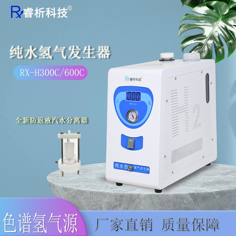 RX-H300C(600C)系列纯水氢气发生器,杜绝加碱液,电解池采用当今国际先进的固体聚合物电解质制氢技术,使产出的氢气含氧量小于0.1ppm,它以纯水为电解液,以钛金属做电极。通电后,阴极产氢气,阳极产氧气。氧气放空,氢气进入汽水分离器后与水分离,经干燥管充分干燥后,从出气孔输出。本仪器采用了高灵敏度,模糊自动跟踪控制系统,即产即用,实现了自动恒压、恒流,使压力稳定精度范围小于0.01Mpa,保证仪器输出氢气纯度高,压力稳定、安全、持续,是替代氢气钢瓶的一种理想的升级换代产品。 三、性能特点: ● 无需加碱、直接电解纯水; ● 具有低水位声光报警、缺水断电功能,保障电解池不干烧; ● 设有安全阀,避免了仪器停机后的虹吸返水现象,有效保护气相色谱仪; ● 采用国际先进的SPE(固态电解)技术; ● 高灵敏模糊系统及自动跟踪系统,压力稳定精度范围小于0.01Mpa; ● 电解槽选用航空钛合金材料; ● 美国进口高分子交换膜,产气纯度高; ● 过流、过热,全自动报警保护系统; ● 液晶屏显示,自动化程度高; ● 日常维护只需补充蒸馏水,即可连续使用。
