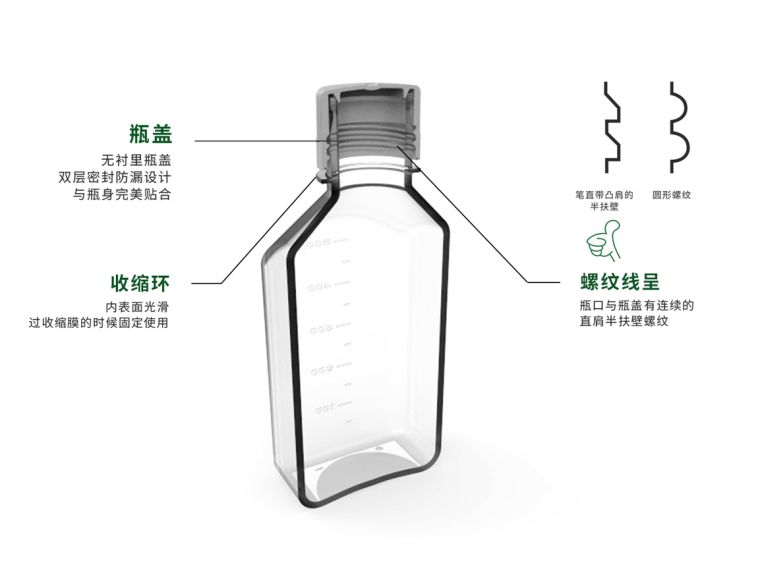 材质 ◆ 瓶身环己二醇(共聚聚酯)(PETG),瓶盖高密度聚乙烯(HDPE),均符合USP Class VI标准。 特点 ◆ 采用符合USP Class VI标准原材料,在10万级洁净车间生产 ◆ 方形设计,易于拿取、节省空间 ◆ 瓶身透明度高,刻度线清晰、准确 ◆ 耐化学性能好,有效阻隔CO2和O2,维持PH稳定 ◆ 瓶壁厚实,耐用,防摔、防刺穿,承压性强、不易变形 ◆ 特殊双层防漏设计,密封性好 ◆ 瓶底带洁特LOGO标记,圆角设计,便于清洗、底座稳定 ◆ 使用温度:-80℃~60℃ ◆ 辐照灭菌,SAL 10-6 ◆ 无DNase/RNase ,无热原、无细胞毒性 参数信息