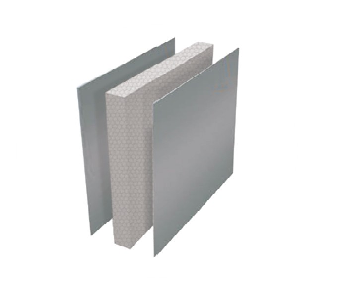 一体化钢面无机硅晶防排烟板是由外层钢板、无机硅晶板和内层钢板采用机械化自动复合流水线工艺制成,芯材层为单层结构的无机硅晶板,内外层钢板为彩钢或镀锌钢板。