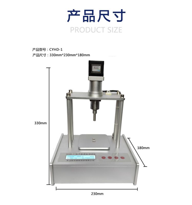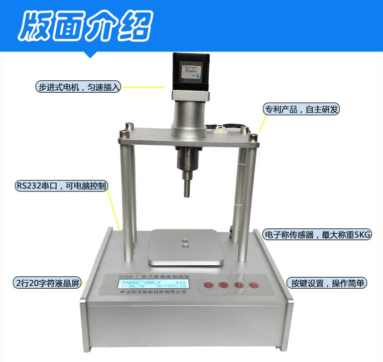 使用方法:果实(馅料)硬度:就是压力与压头截面积的比。将压头均速插入果肉(馅料)中规定的深度 ,取得的稳定平均值,即是果实(馅料)硬度。 启动测量时,压头向下运动,当压头接触到果实(馅料),设备开始记录果实(馅料)硬度,直到压头运行到zhiding深度(默认10mm)。硬度计对采集的数据进行比较,运算,取得稳定阶段的平均值作为硬度值显示。 压头完成测量后,自动返回测量原点,硬度计显示测量结果。如果电脑软件启动测量,可以读回详细数据,并生成,保存,打印硬度曲线。 技术参数: ●zuida称重:5Kg ●称重分辨率:1g ●精度:0.1千克/平方厘米 ●误差率:±0.1千克/平方厘米 ●压头截面积:1、12.5 mm2;2、50 mm2 ●硬度显示单位:1、Kg/cm2;2、Lb/ cm2;3、g ●压头zuida运行距离:30mm ●传感器的结构;应变片式铝合金称重传感器 ●电源:220V交流 ●屏幕显示:2行20字符液晶屏 ●外型尺寸:230mm×180mm×330mm |