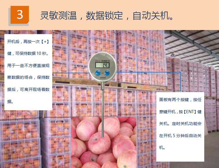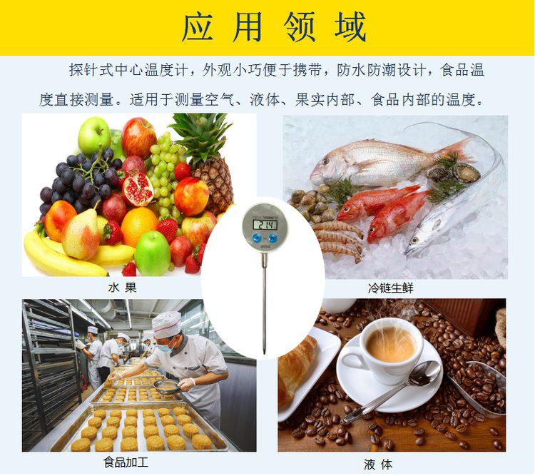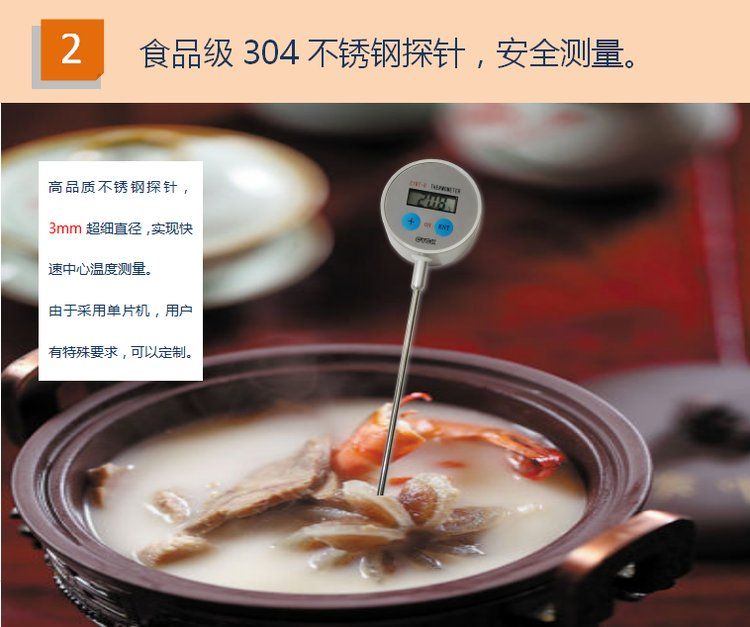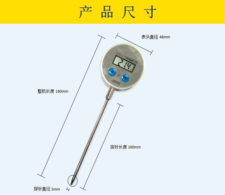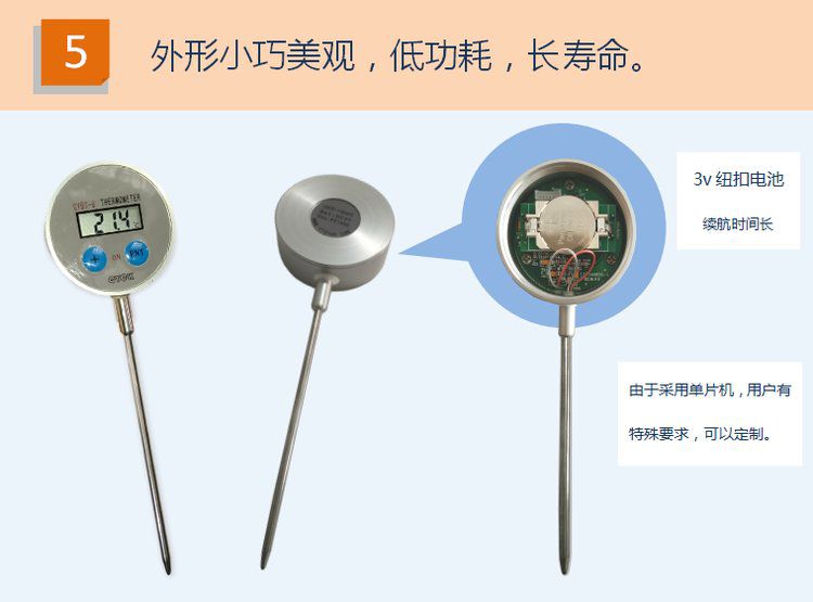 CYBT-6 便携温度表 用于测量空气、液体、果实内部、食品内部温度,是一款便携式 手持式 探针式温度计,核心采用16位单片机,配合进口PT1000温度传感器,达到了很高的测量精度。采用不锈钢探针式封装,经过特殊工艺处理,反应速度快,便于使用。整机采用防水设计,适合潮湿环境使用。由于采用单片机,用户有特殊要求,可以定制。 技术参数: 测温范围:-60℃ -- +200℃(可扩展至:-100℃ -- +300℃) 分辨率:0.1℃ 精确度:±0.1℃ 电源:DC3V 1个钮扣电池 整机尺寸:150mm(长) 探杆长度:100mm(长) LCD显示尺寸:25mm(长)×10mm(宽)