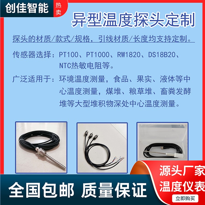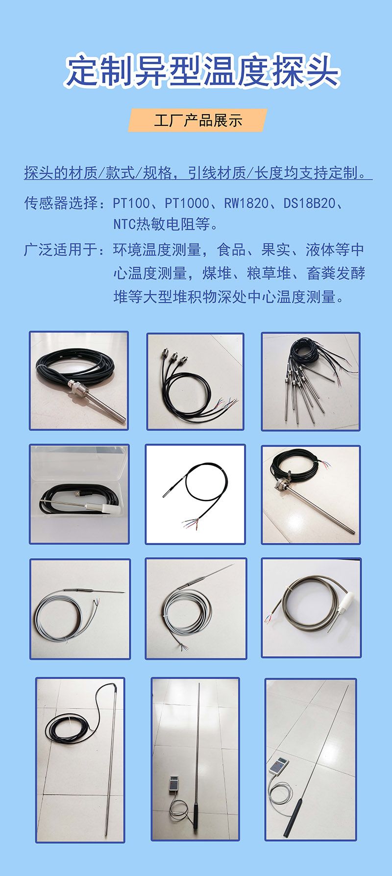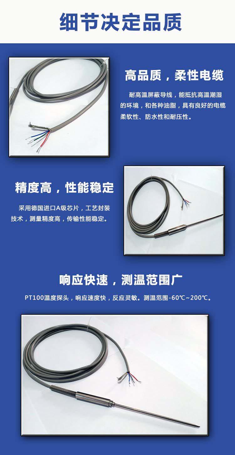 温度测量实力工厂,30年的行业经验,精度高,支持定制。 1、PT100温度传感器采用进口产品。 3、探针式温度探头性能参数: ●温度传感器:PT100(德国进口) ●温度范围:-60℃ -- +200℃ ●探针长度:100mm(前端为锥形) ●探针直径:3mm/2mm ●探针部分材质:不锈钢 ●手柄长度:60mm ●手柄直径:12mm ●手柄材质:铝合金/不锈钢 ●导线长度:3米(可定做) ●导线材质:硅胶耐高温导线 ●引线方式:三线制 Title:PT100温度探头 Keywords:食品蒸柜温度探头,PT100温度探头,定做温度探头 Description:食品加工专用温度探头