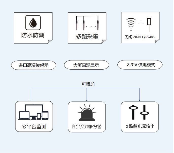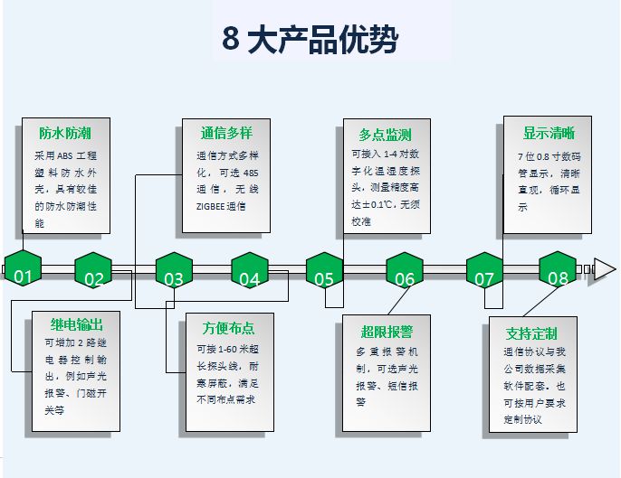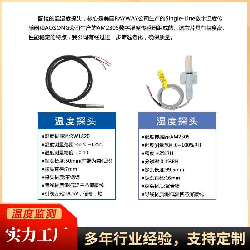 ●温度测量范围:-55℃~125℃(DS18B20) ●温度测量误差:+/-0.1℃(-20℃~+50℃),+/-0.2℃(-55℃~+125℃) ●分辨率:0.1℃ ●湿度测量范围:0%~99%(HM1500) ●温度测量误差:<3% ●分辨率:1% ●通讯接口:RS485接口(默认) 无线433M通信(可选) 无线ZIGBEE通信(可选) ●接入探头数:1-4对 ●报警输出:1路继电器开关 ●电源电压:180V~240V ●环境温度:-20℃~60℃ ●外型尺寸:200mm×120mm×60mm