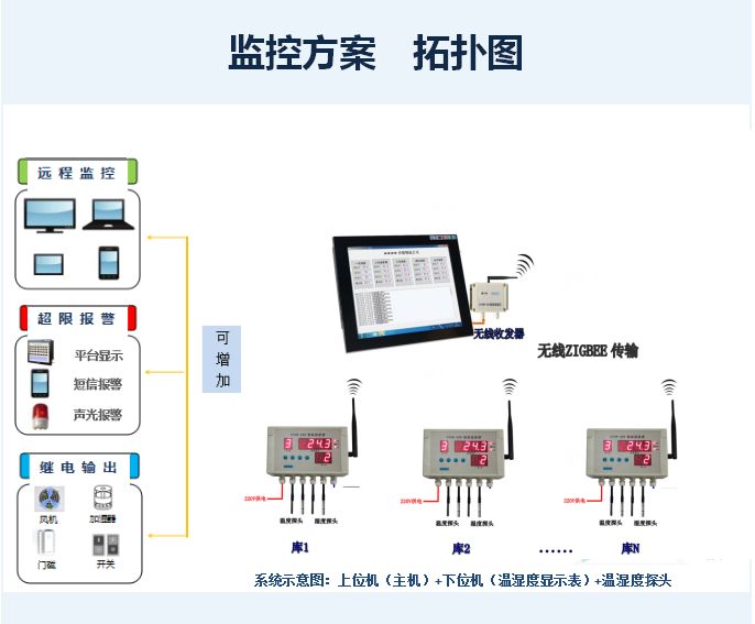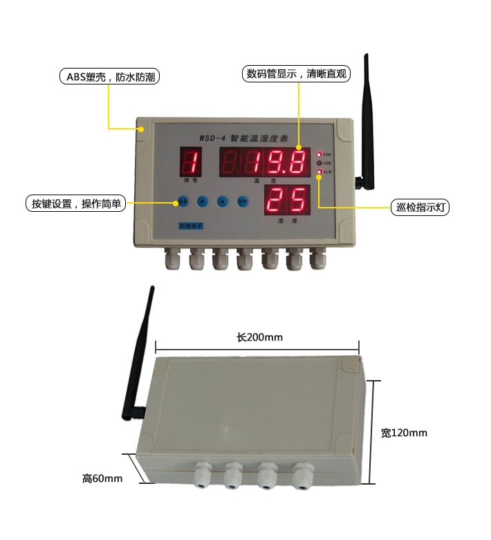 1、采用ABS工程塑料防水外壳,具有较佳的防水防潮性能。 2、通信方式多样化,可选485通信、无线433M通信,无线ZIGBEE通信。 3、可接入1-4个数字化温度探头。 4、可接入1-4个一体化湿度探头。 5、7位0.8寸数码管显示。 6、当温度或湿度超过设定范围时,可输出报警信号(需外接报警器)。 7、与温湿度监控软件配套使用,将数据上传到电脑,保存到数据库。可查询报表和历史曲线等。