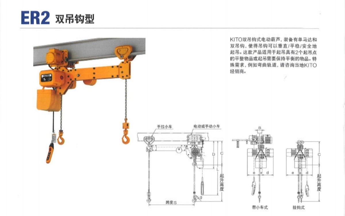 KITO双吊钩式电动葫芦,装备有单马达和双吊钩,使得吊钩可以垂直/平稳/安全地起吊。这款产品适用于起吊具有2个起吊点的平整物品或起吊需要保持平衡的物品。
