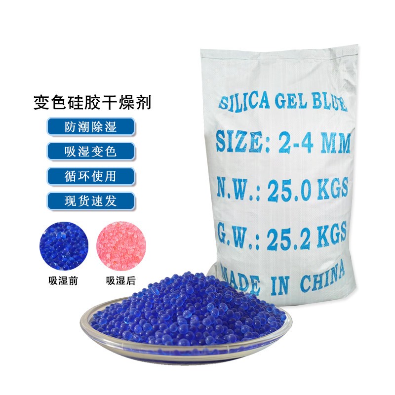 3-5mm变色硅胶干燥剂蓝色变色硅胶干燥剂外观为蓝色颗粒,为球形或不规则形状的颗粒,其主要成分为二氧化硅,颜色随湿度不同而变化。