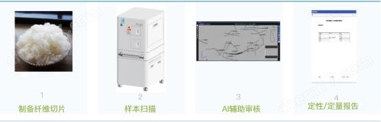 支持24小时无人值守扫描,对扫描出来的图像后台自动分析,定位并提取每一根纤维,使用人工智能技术计算纤维的含量和直径,自动进行定性和定量检测,适用于天然和非天然纤维。并且支持云存储服务,检验人员可以进行远程访问和审核,不需要在实验室进行办公; 使用多层扫描技术进行扫描,支持查看每一根纤维在不同对焦轴上的形态特征,支持对每一根纤维类型的修改,自动出具检测报告。极大地节省了人力成本; 产品工作流程如下: