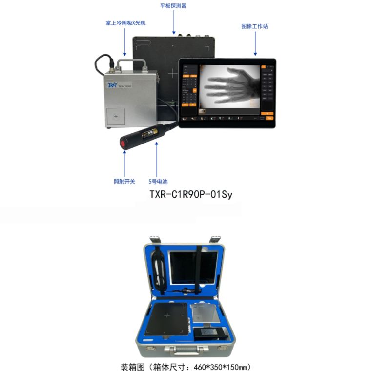 掌上冷阴极X光机系统由冷阴极X射线源(型号 TXR-C1R90P-01)、图像工作站与平板探测器(根据用户需求配置)构成。使用单节5号电池驱动 X 射线源及探测器可在无外接电源环境中进行检测。X 射线源与探测器的控制由专用软件实现。图像工作站采用高配平板,电池续航能力优秀,且纤薄轻巧。 掌上冷阴极X光机系统小巧轻便,单人即可轻松携带全套设备,实现即时拍照,高效便捷。