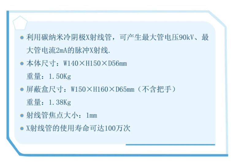 冷阴极X射线源 是产生X射线的发生器。它体积小、仅用单节5号电池供电,适合随身携带到检测地点。照射过程可使用照射开关进行操作,或由计算机上的专用程序执行完成。 TXR-C1R90P-01技术规格