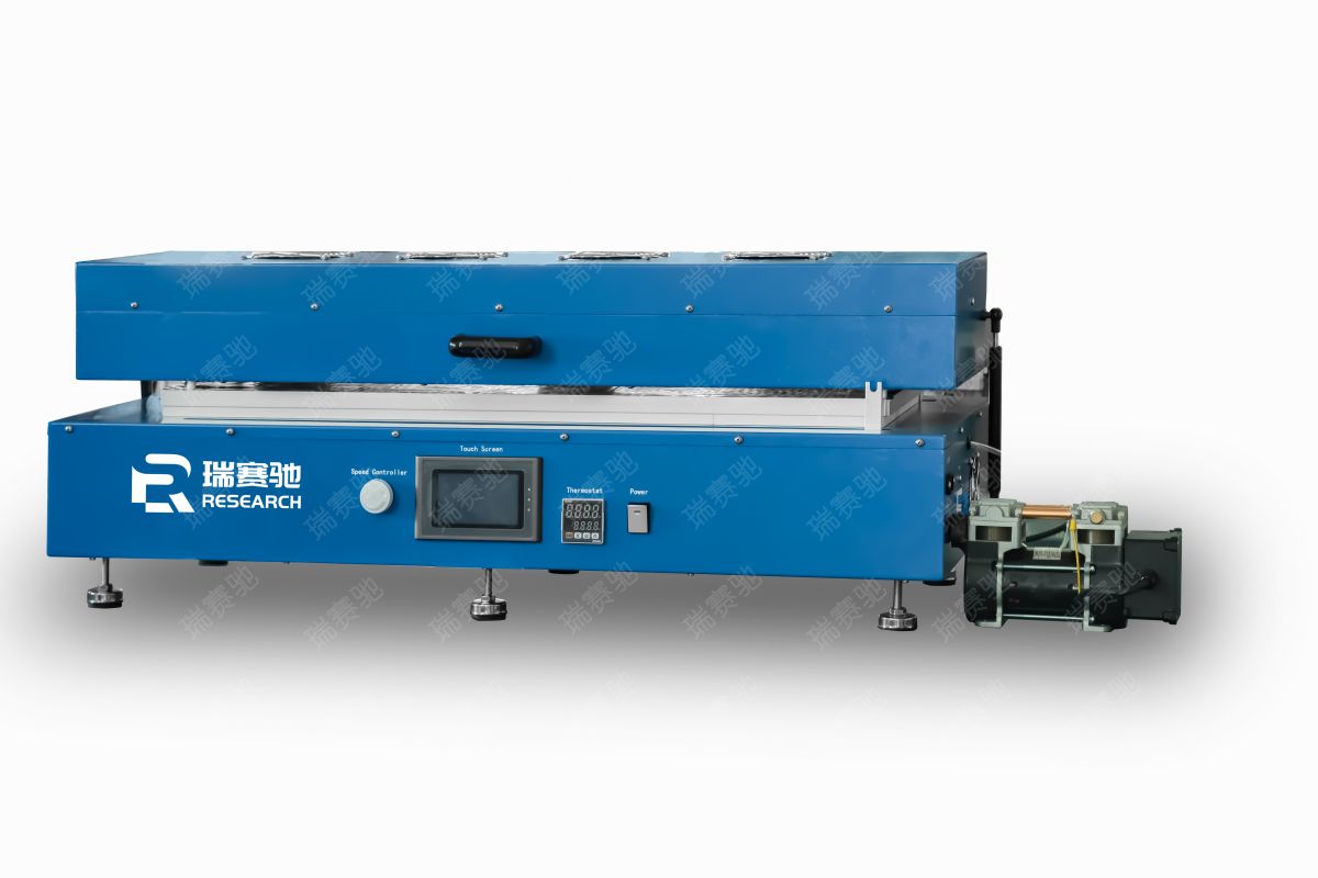 一.产品名称:自动涂膜烘干机Plus 二.产品型号:RSC - VCH - 800 三.产品简介:自动涂膜烘干机Plus是一款涂膜行程达到800mm长的平板式涂覆机,含真空吸盘和无油真空泵,配合刮刀可制作长的厚膜。具有独特的自动推进装置,可以在150mm宽度800长度范围内在任何材料上生产光滑的涂层,是低成本研发制作18650电池电极材料的理想工具。 *强风循环烘干加热,数字显示温度控制,最高工作温度130℃; *数字显示计时器,可自由设定烘干时间; *涂膜速度在0~120mm/秒范围内可调; *真空铝盘,可快速放置或取下基片; *在0~800mm之间可通过行程开关调整行程; *带调整涂膜厚度(精度0.01mm)的刮刀; *外形尺寸小,可节约空间; *外观精致,钣金采用立体几何设计,简洁美观; 六.产品外观:(以实物为准) 七.技术参数 *涂膜速度:0~120mm/秒; *在0~800mm之间可通过行程开关调整行程。 *含无油真空泵1台; *功率:1.8KW *重量:70KG; *外形尺寸:L1000mm×W350mm×H320mm;