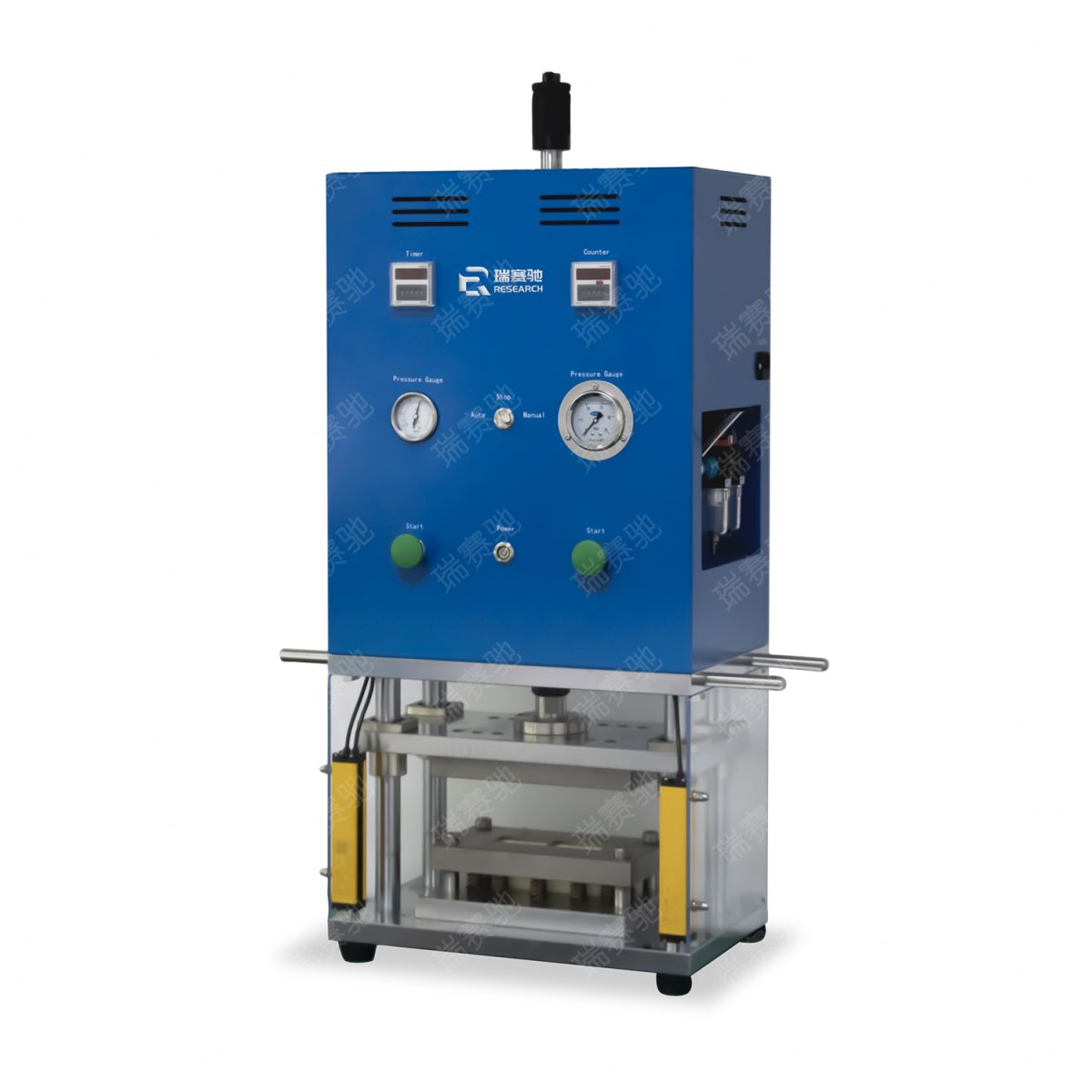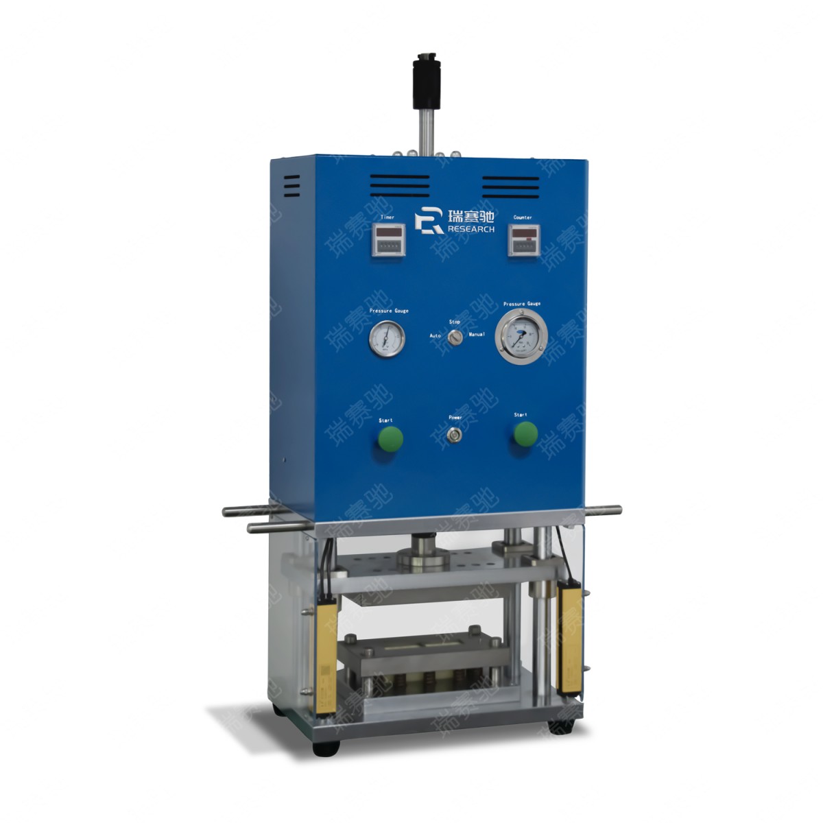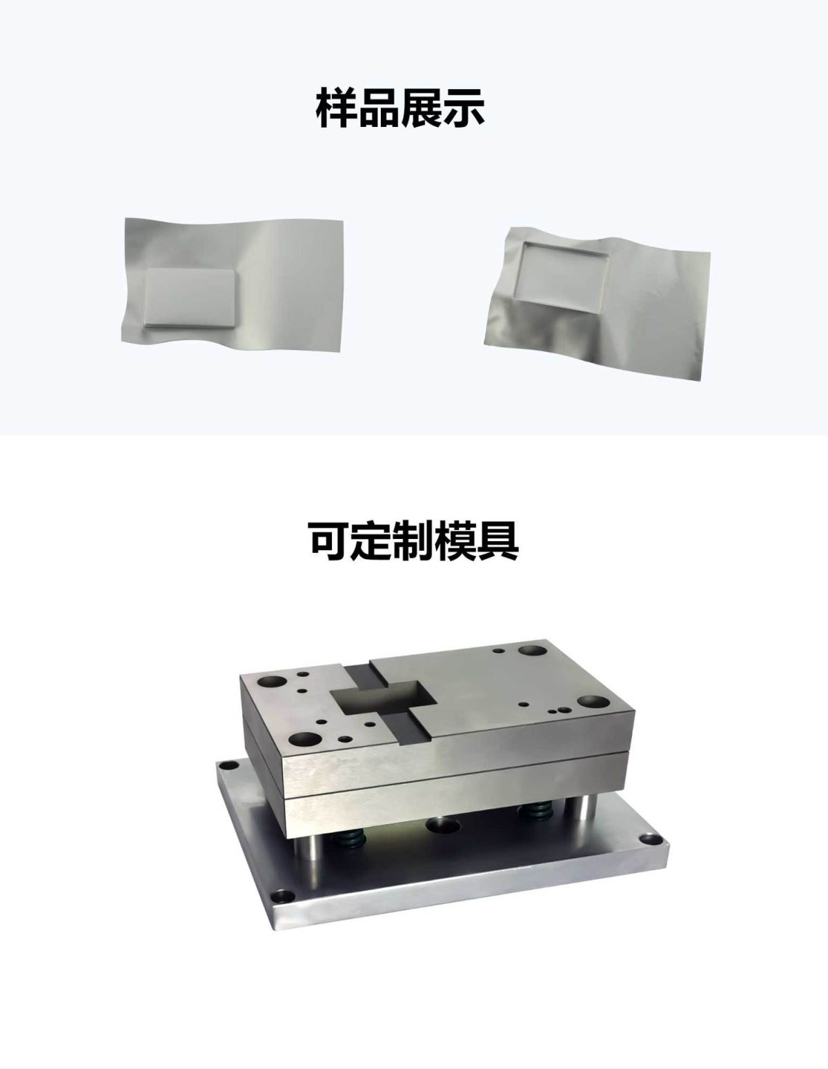 一.产品名称: 半自动铝塑膜成型机 二.产品型号:RSC-CF-200 三.产品简介:半自动铝塑膜成型机是一款应用于软包锂离子电池的铝塑膜成型设备。该设备通过增压缸驱动,可根据客户要求来制作相应尺寸的模具,从而实现对不同尺寸的锂离子电池铝塑膜外壳成型。 四.主要特点: *采用四根导柱结构,上下滑动顺畅精度高; *更换模具、调节拉伸深度简单、快捷; *与同类产品相比,同等质量的铝塑膜本产品拉伸的更深、更稳定; *精密的模具设计,成型后产品各角位及周边无鱼尾纹及塌角; *采用光幕及外罩保护,使用安全; *采用进口模具材质及高强度的铬钢和合金铝,表面经过环保电镀和烤漆处理; *外观精致,钣金采用立体几何设计,简洁美观; *操作简便、安全可靠、体积小; 六.工作过程说明:将切好的铝塑膜片放入模具内定位,然后按下起动按钮,动力源驱动模具将铝塑膜自动冲壳成型,取出铝塑膜即完成。 七.技术参数 *适用规格:最大冲壳L150mm *W120mm(单坑封四边型) 最大冲壳L100mm *W100mm(单/双坑对折型) 放铝塑膜最大尺寸规格:L240mm *W160mm; *设备产能:200~400EA/H; *动力源:3T *电源:AC220V/50Hz; *功率:0.3KW; *气源:0.5MPa~0.7MPa; *设备重量:约150kg; *设备尺寸:长x宽x高≈460x320x925mm; *模具部分:依据冲壳尺寸而定 *模具/模芯粗糙度:0.4 *上下模平面度:0.02mm *模芯平面度:0.02mm *成型长度公差:±0.1mm *成型宽度公差:±0.1mm *成型厚度公差:±0.1mm 八.主要电气及标准件品牌