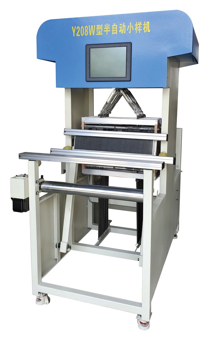 Y208W型半自动小样机 用途: Y208W型半自动小样机用于棉、毛、丝、麻、化纤、混纺等各类织物的小样试织。 Y208W型气动小样织布机具有噪声小、结构可靠耐磨、性能稳定等特点。广泛应用于纺织、印染、色织等行业及大专院校相关专业教学、科研单位。 主要技术指标: ●型号:Y208W ●幅宽:20英寸 ●选色:人工 ●引纬:手动 ●综数:16棕 ●卷取:自动卷曲 ●纬密:纬密电脑设置,自动校正 ●送经:恒张力气动阻尼送经 ●打纬:手动 ●提综:气动提综开口 ●编程方式:触摸屏编程 ●显示方式:10英寸26万色触摸 屏 ●操作系统:Microsoft Windows CE 可配电脑及管理系统软件,同时可以通讯电缆连接 ●程序保存方式:U盘/SD卡 ●网络接口:100M网络接口 ●外形尺寸:L1300×W860×H1800mm ●气源控制:气源压力0.45~0.8Mpa,最 大耗气量200L/min ●随机附件:每台小样机配穿棕、穿筘工具一套,摇纱架1台,综丝2包,气管1根,钢筘2块(备用1块)筘号多种(100、80、75、70、65、60、50、40可选) |