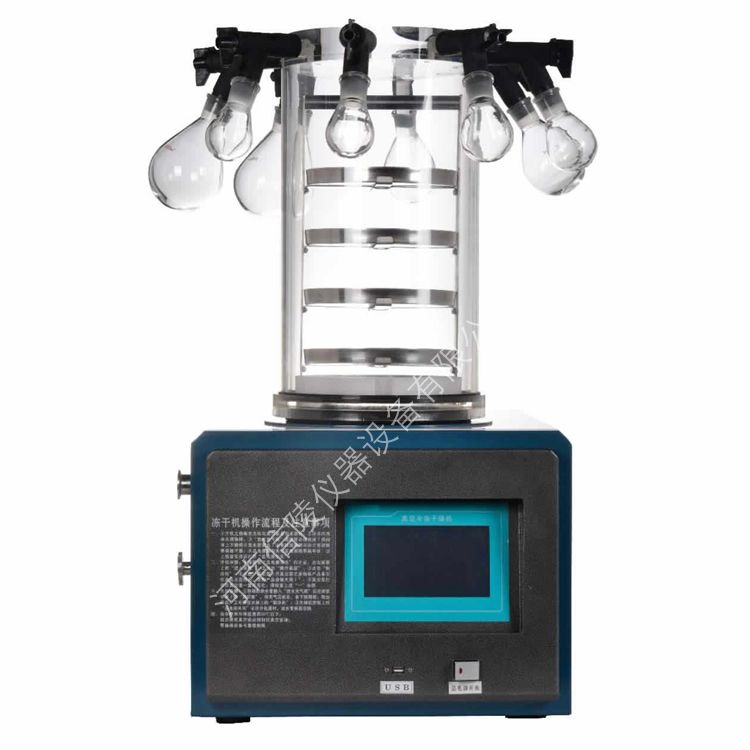优势功能特点: 1. 采用进口品牌压缩机,结合单机混合环保制冷技术,确保高效制冷与环保性能; 2. 制冷速度快,冷阱内壁温度分布均匀,配备良好的气体导流技术,捕水效率高; 3. 内置冷阱样品预冻功能,无需额外配置超低温冰箱或液氮处理,操作更便捷; 4. 配备7寸彩色液晶触摸屏,人机交互界面友好,支持锁屏功能,并可选配APP实现远程控制; 5. 采用工业级嵌入式操作系统,响应速度快,数据存储容量大,运行稳定可靠; 6. 主界面设计简洁直观,实时显示冷阱温度、真空度、样品温度、运行时间等关键参数,操作简单易上手; 7. 支持数据查看、导出和删除功能,冻干数据自动保存,防止丢失,并可通过USB接口导出; 8. 兼容多种容器,包括安瓿瓶、西林瓶、玻璃烧瓶、培养皿和物料盘等,适用范围广; 9. 标配高效真空泵,噪音低、抽速快,可快速达到高真空状态; 10. 配备防腐蚀真空连接管,附带国际标准KF真空快接卡箍,连接方便且耐用; 11. 实时记录并显示冻干过程中的关键数据,如冷阱温度、样品温度、真空度、运行时间和隔板温度等; 12. 仪器结构紧凑,体积小巧,便于实验室摆放和搬运; 13. 冻干数据自动保存,支持实时查看和历史数据复现,冻干过程全程可控; 14. 支持存储多组冻干曲线,可通过U盘导出数据,兼容电脑上位机浏览,并支持打印功能; 15. 干燥室采用无色透明一次注塑成型聚碳材料,耐腐蚀、抗冲击、无粘接、透明度高、密闭性强,可清晰观察冻干全过程; 16. 冷阱腔体和物料盘架均采用卫生级不锈钢材质,冷阱内无盘管设计,光洁耐腐蚀且易于清洁,同时具备物料预冻功能; 17. 冷阱干燥室采用耐高压、耐低温的航空有机玻璃材料,可全程观察物料冻干状态,直观清晰。