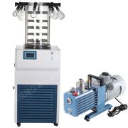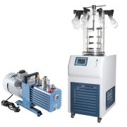浓缩液真空冷冻干燥的具体应用: • 实验样品浓缩:用于浓缩生物化学实验中的样品,保持其活性和稳定性。 • 标准品制备:用于制备高纯度的标准品,用于分析和检测。 • 果汁浓缩:真空冷冻干燥技术用于浓缩果汁,能够保留维生素、风味物质等热敏性成分,同时缩短浓缩时间。 • 乳制品浓缩:用于牛奶、酸奶等乳制品的浓缩,避免蛋白质变性,保留风味。 • 食品添加剂:用于浓缩天然香料、色素等食品添加剂,保持其原有品质。 • 生物制药:用于浓缩液、酶等生物制品,保持其生物活性,延长保质期。 • 细胞和组织保存:用于浓缩和保存生物样本,如细胞、组织等,确保其活性。 • 催化剂浓缩:用于浓缩高价值的催化剂,保持其活性和纯度。 • 环境样本处理:用于处理水样、土壤样本等,保持其原始化学成分,便于后续检测。 • 生物监测:用于保存发光细菌等生物监测样本,确保其活性。 功能特点: 1.配备7英寸全彩触控液晶屏,搭载人性化操作界面,支持屏幕锁定功能,可选装APP实现远程智能控制; 2.实时显示冷阱温度、样品温度、真空度、运行时间、隔板温度等冻干数据,实时生成冻干曲线; 3. 配置多歧管真空系统,支持8种样品并行处理,每个独立工位均配置硅胶密封阀,通过阀门实现各冻干工位真空度的调控。 4. 智能数据管理系统自动存储冻干记录,支持实时监控与历史数据回溯,确保工艺过程全程可追溯; 5. 多组冻干数据存储功能,支持通过U盘进行数据转存,兼容计算机端数据查看及打印输出; 6. 采用进口品牌制冷机组,集成环保型混合制冷技术,制冷系统实现冷阱快速降温,优化腔体温度均匀性,导流设计显著提升凝冰效率; 7. 标配一台真空泵,具备快速抽真空能力,配备防腐蚀真空连接管,附带国际标准KF真空快接卡箍,可与多种真空泵联用; 8. 内置冷阱预冻模块,免除额外配置超低温冰箱或液氮预处理的必要; 11. 数据管理三合一功能(查阅/导出/删除),自动备份保障数据安全,标配USB数据接口; 12. 支持安瓿瓶、西林瓶、玻璃烧瓶、培养皿和物料盘等的冻干; 13.真空泵保护功能,当冷阱温度达到-40℃时,真空泵才能启动,避免水气进入真空泵里缩短真空泵的寿命。 15. 全参数实时监控系统,持续记录冷阱温度、样品温度、真空度等关键工艺数据;