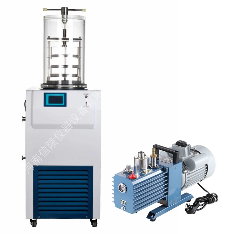 冷冻干燥机干燥流程如下: 1. 将物料灌装进西林瓶,浮盖好胶塞并保留缝隙以利于水分升华; 2. 预冻西林瓶物料,确保物料内部液态水分全部冻结成冰晶; 3. 开启真空泵以升华水分,将预冻好的西林瓶放入架子上并观察真空度下降速度,确保真空度达到20pa以下。若未达到,需要检查冻干罩和主机的连接以及管道接口的密封性; 4. 冻干结束后,通过压盖手柄将西林瓶胶塞压紧,真空包装,并打开放气阀以使里外压力平衡,然后关闭真空泵; 5. 冷阱化霜,冷阱中的水分升华后凝结成冰霜,待自然融化后通过放水阀流出。然后将残留的水分擦拭干净,保持台面和冷阱干燥。 技术参数: 真空压盖干燥系统:可实现西林瓶装物料的密封真空包装; 冻干面积:0.1m² 冻干量:1L(以厚度10mm计) 冷阱温度:≤-60℃(标配),可选配≤-80℃ 捕水量:6kg/24H 真空度:≤1Pa(空载) 抽气速率:4L/S 物料盘:3块,直径200mm,不锈钢材质 物料盘间距:100mm 西林瓶装载量: 西林瓶Φ12mm:630支 西林瓶Φ16mm:358支 西林瓶Φ22mm:180支 整机功率:1100W 外形尺寸:560×560×980mm 重量:88kg 电源:AC220V 50HZ 整机运行噪音:≤55dB 质保期限:主机免费质保一年