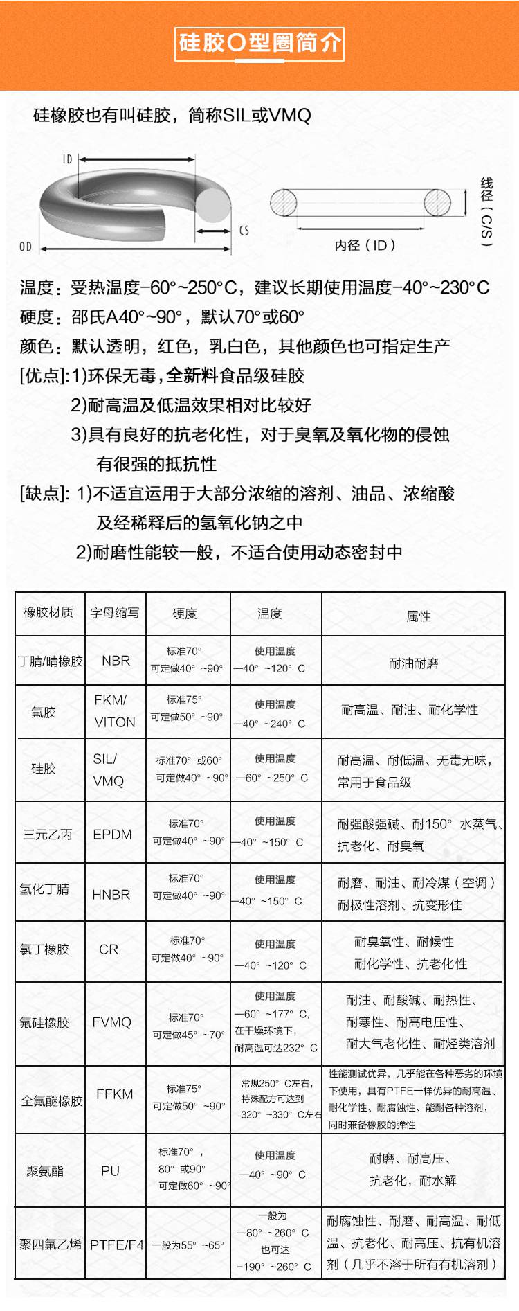 食品级氟胶密封圈简要介绍: 食品级氟橡胶密封圈——耐高温性优于硅橡胶,有的耐候性、耐臭氧性和耐化学性,耐寒性则不良。对于大部份油品及溶剂都具有抵抗能力,尤其是酸类、脂族烃、芳香烃及动植物油。适用于柴油发动机、燃料系统及化工厂的密封需求。不建议使用于酮类、低分子量的酯类及含硝的混合物。一般使用温度范围为 -20~250 ℃。 食品级氟胶密封圈应用: 氟弹性体由于具备优异的阻燃性、气密性、耐高温、耐油、耐溶剂、耐燃、耐化学物与耐气候的性质,通常用于汽车业、化学制程、航天与许多任务业上。值的一提的是氟弹性体密封件是能在高真空条件下使用,在1.33*10 -7pa以下,其他橡胶都不能用于密封。国内外的生产商都会用以生产产品,诸如美的公司的产品密封圈就是使用这一类的材质。 氟胶密封圈用途:汽车、机车、柴油发动机及燃料系统密封;化工厂的密封件。 一、食品级硅胶密封圈参数: FDA食品级FKM/FPM氟橡胶O形密封圈 断裂伸长率/%≥300 抗撕强度/KN?m-1≥20 抗拉强度/Mpa≥5.0 线收缩率/%0.1 硅胶英文简写:SIL/S 别名:氧化硅胶或硅酸凝胶 英文名称:Silica gel; Silica 分子式:xSiO2?yH2O 硅胶颜色:可以做成任何一种颜色. 硅胶硬度:20-85度. 硅胶本色:透明. 密 度1.1-1.12g/c㎡ 伸长率600%-700% 简称:SIL/S 大硬度:85度 规格:可在-60度~+200度温度范围内长期使用。