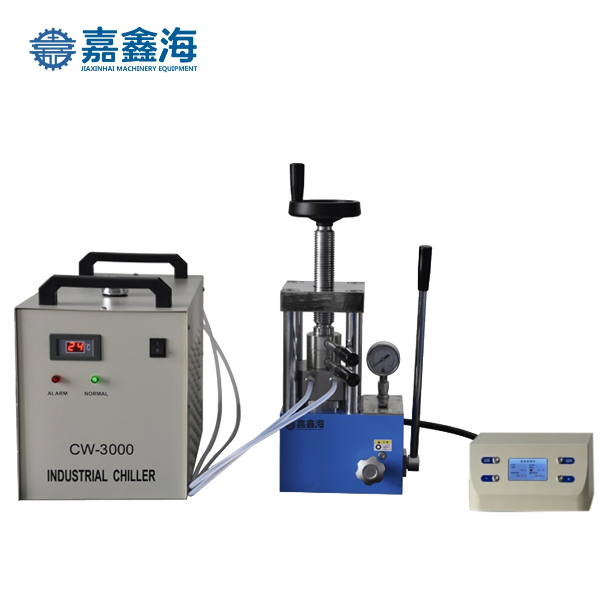 操作步骤: 1、将样品放置到模具中,旋紧丝杠; 2、打开温控器,按下SET键选择设定温度的数值,再按+ -键更改控制温度的数值大小,确定好后按CAL键退出; 3、模具开始升温,直到升至我们设定的温度,一般不得超过300℃; 4、拧紧放油阀门,摇动压把开始加压,加压到所需压力; 5、将压力保持一段时间; 6、将温控器的加热温度设定为0,停止加热; 7、打开水冷机,对加热板进行快速降温,将设备降到室温,或自然降温到室温;
