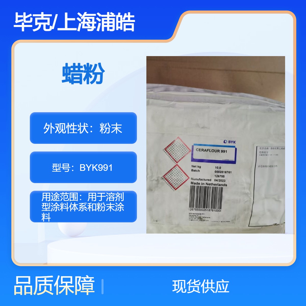 用途:CERAFLOUR 991 用于基于聚酯/TGIC/β -羟烷基酰胺,聚酯/环氧,丙烯酸脂,聚氨酯和环氧的粉末涂料。