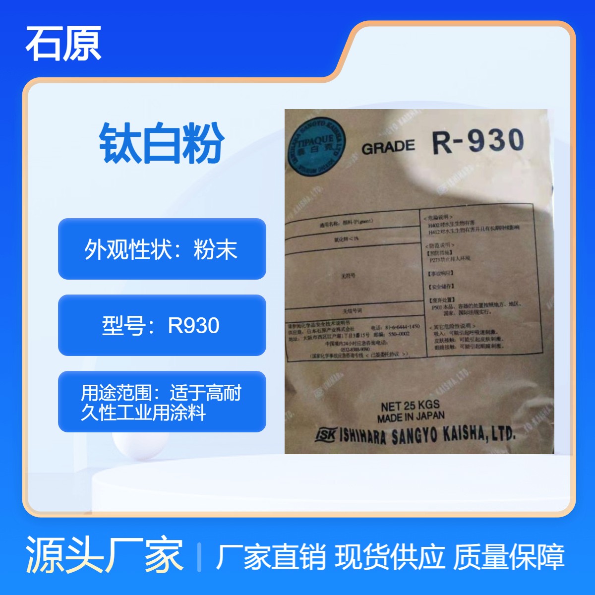 日本石原钛白粉R-930 品牌:石原 型号:R930 晶型:金红石型 产地:日本 包装:25公斤/袋、1吨/托盘 发货地:上海 是一种采用硫酸法生产的抗粉化金红石型二氧化钛颜料。它的晶格被氧化锌固定,并经过铝化合物后处理。 在生产过程中控制去除粗粒子,使粒度分布均匀。因此,它具有极高的光泽度、不错的遮盖力和着色力且易分散。在硫酸法金红石型二氧化钛颜料中,该牌号的耐久性不错。这些性能特别适用于水性涂料系统。 用途广泛,特别适于高耐久性工业用涂料。