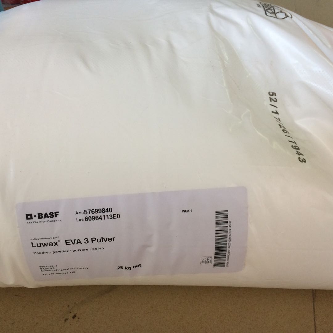 【用途与特点】 1.为乙烯,醋酸乙烯共聚蜡,有较高的极性,优越于均聚聚乙烯蜡 2.粘度较低,120度下为1200-1500.熔点在93-98度。 3.与颜料亲和性高,尤其适合于分散炭黑及难分散颜料,可生产高浓度色母。 4.通用性好,适用于PE、PP、PVC、PS、PC、PU、PA(尼龙)等多色母粒,尤其对于黑色色母粒的分散剂更佳,可显著提高其着色率. EVA3蜡(Luwax EVA3)聚乙烯蜡系列:含有乙烯/醋酸乙烯酯的聚乙烯蜡共聚物(EVA)的聚乙烯蜡,其中醋酸乙烯酯(Vac)含量(wt%)在13-15。具有较高的熔体黏度(120℃):1200-1500(mm2/s),与颜料亲和性高,尤其适于分散碳黑及难分散颜料。另外,亦推荐应用于TPU。例如Luwax EVA3,在塑胶行业有很好的知名度。该系列还有其他产品,如Luwax EVA1, Luwax EAS4等。 Luwax EVA3是BASF公司生产的一种共聚物蜡,属高压无催化聚合产品,具有极性高、分子量分布窄,耐热性好等特点。可广泛应用于塑料行业及食品包装的生产,性能**。