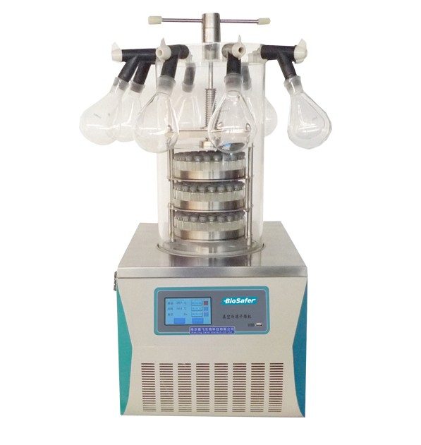Biosafer-10D(多歧管压盖型) 技术特点: 真空冷冻干燥机广泛在医学、制药、生物研究、化工和食品等领域。经冷冻干燥处理的物品易于长期保存,加水后能恢复到冻干前状态并保持原有生化特征。 技术特点: 一体式结构设计,体积小,无外置法兰、使用方便、无泄漏; 所有与产品接触的材料均使用惰性材料,满足GLP的要求; 冷阱和操作台面采用不锈钢材质,防腐蚀,易清洗; 全不锈钢充气(放水)阀门本公司自行设计、生产、安全、防腐、无泄漏; 冷阱开口大,无内盘管,带样品预冻功能,无需低温冰箱; 专门化的气体导流技术,冷阱捕冰均匀,捕水能力强; 国际知名品牌压缩机,高效节能、使用寿命长、噪音低; 知名品牌真空泵,抽速大,实现更高的极限真空度; 工业级嵌入式FD-LAB冻干机专用控制系统,具有较高的可靠性和稳定性; 智能化数据记录系统,可查询历史曲线及历史记录数据,并可实现数据记录U盘导出。 商品参数: 冷阱温度(℃):-56/-80 真空度(Pa):<10 冻干面积(m2):0.08 捕水能力(Kg/24h):3 物料装载(ml):800 物料盘规格(ф*h mm):180 物料盘层数(层):3 整机功率(W):970W 主机重量(kg):41 西林瓶(ф22mm)、(ф16mm)、(ф12mm):165、285、560 外形尺寸(L* W * H mm):615*450*370+钟罩430 |