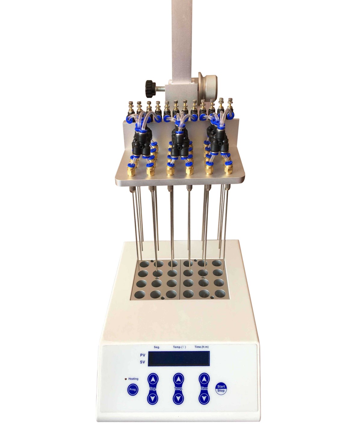 Biosafer MD200-2干式氮吹仪 Biosafer MD200-2 氮吹仪主要应用于大批量样品的浓缩制备,如药物筛选、激素分析、液相、气相及质谱分析中的样品制备。工作原理:通过将氮气吹入加热样品的表面,使样品中的溶剂快速蒸发、分离,从而达到样品无氧浓缩的目的,保持样品更纯净。使用氮吹仪代替常用的旋转蒸发仪进行浓缩,能同时浓缩几十个样品,使样品制备时间大为缩短,并且具有省时,易操作,快捷的特点。 产品特点(本仪器具有编程功能) 加热器使样品被快速有效地加热至蒸发温度,同时气体由气体腔经气针吹至溶液表面,促进溶液快速蒸发和样品浓缩; 有24个气道控制开关,不浪费气体; 整个工作系统由可调节的气体腔和加热器组成; 气针在气腔的位置可被改变,使之适用不同的试管.标准气针长度为150mm; 气腔高度可根据溶剂液面高度调节,在浓缩有毒溶剂时,整个系统可置于通风柜中; 自动故障检测及报警功能; 标准配备气腔和专用可调节支架; 内置超温保护装置; 即时温度显示、时间递减显示。 技术参数 温度范围:室温+5℃~150℃ 升温时间:≤30min (从40℃升至150℃) 温度精度@40~100℃:±0.5℃ 温度精度@100~150℃:±1℃ 温度稳定性@100:±0.5℃ 模块数:2件(标配16.5mm*24孔) 显示精度:0.1 时间设置最长:99h59min LCD液晶显示(5组程序可控制) 氮气流量:0~10L/min 氮气压力:≤0.1MPa 最大功率:600W |